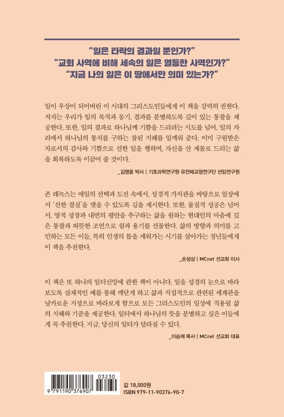 이 시대 일(노동)을 하는 모든 그리스도인들에게 이 책을 권합니다. 저자가 목회자나 신학자가 아니라 저는 개인적으로 더 기쁜 책이라 생각합니다. 이런 다양한 목소리들이 더 나와야 한다고 생각하구요. 아래에 제 추천사를 대신합니다.