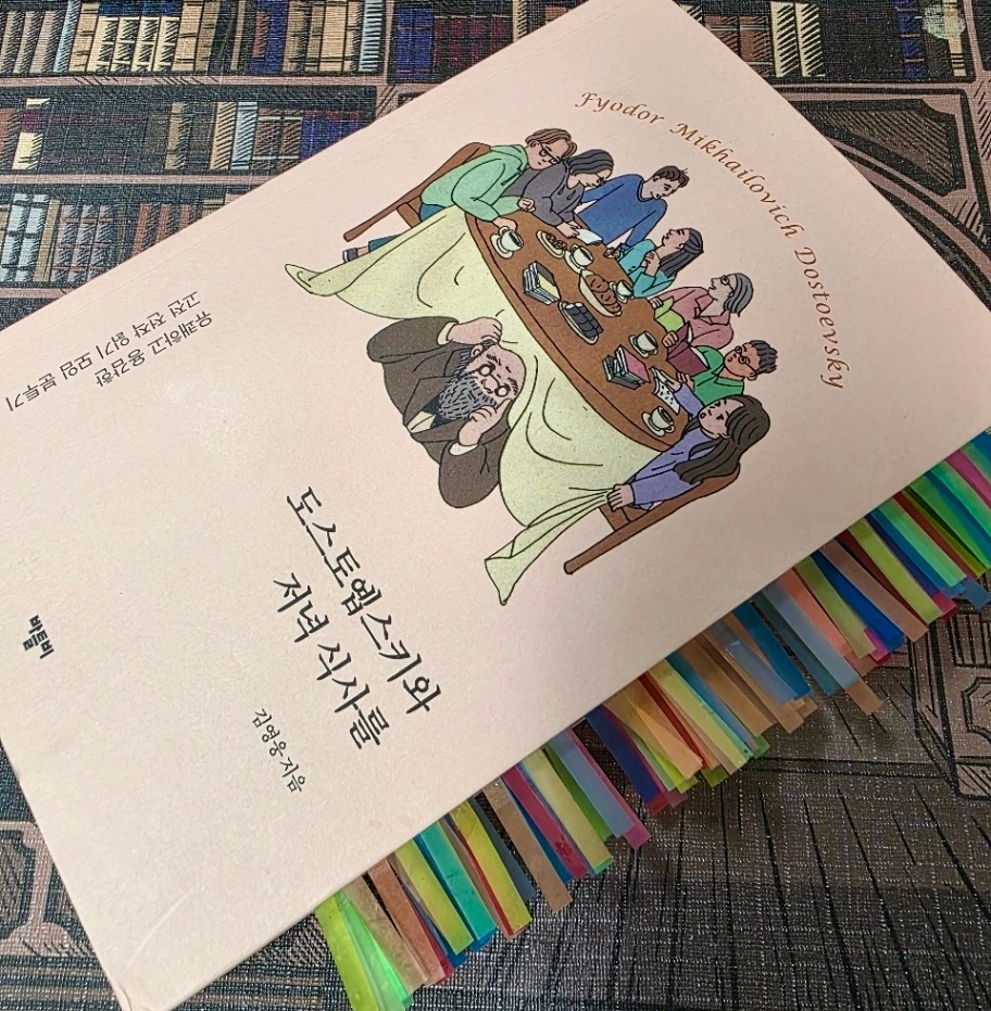 모임 멤버 중 가장 많이 나눠주신 한 분께서 이런 사진을 올려주셨습니다. 좋은 문장이 많다고 칭찬도 해주셨답니다. 저기 붙은 형광 책갈피들이 보이시죠? 어떤 저자가 이런 사진을 보고 감동하지 않을 수 있겠어요? 이게 다 도스토옙스키 덕분이라고 생각합니다. 저에게 가장 지대한 영향을 끼친 작가죠.