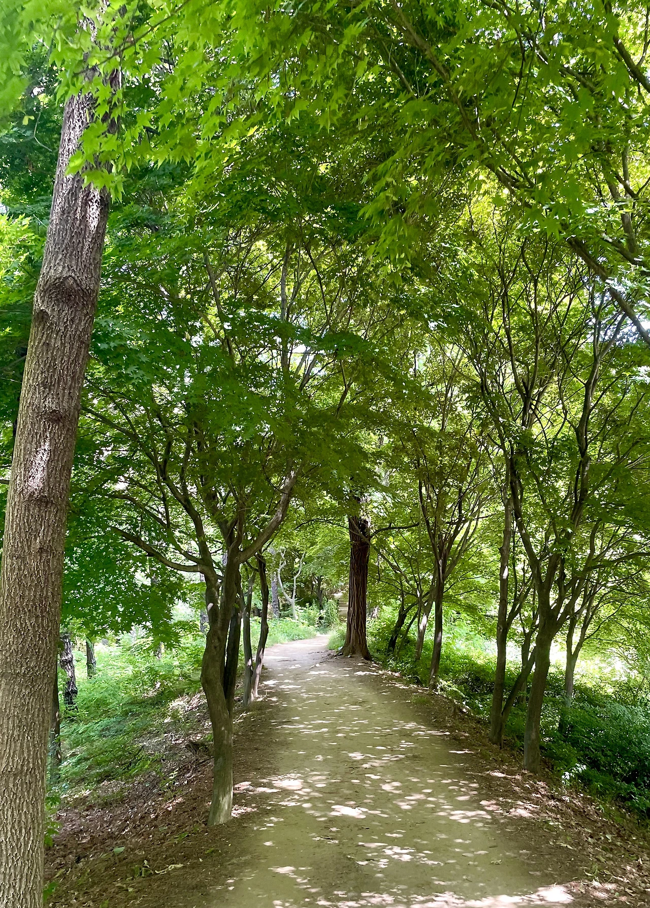 땡볕을 걷다가 풍성한 가지가 드리운 그늘 아래로 들어서면 동공이 확장되면서 비로소 눈이 열린다. 저 멀리서 어둡게만 보였던 숲 속 세상이 보란 듯이 내 앞에 펼쳐진다. 어떤 표현이 가장 적당할까 하는 생각을 하려는 찰나, 층층의 많은 가지들 덕분에 옅어진 햇살은 싱그럽게 우리를 비추고 있었다.