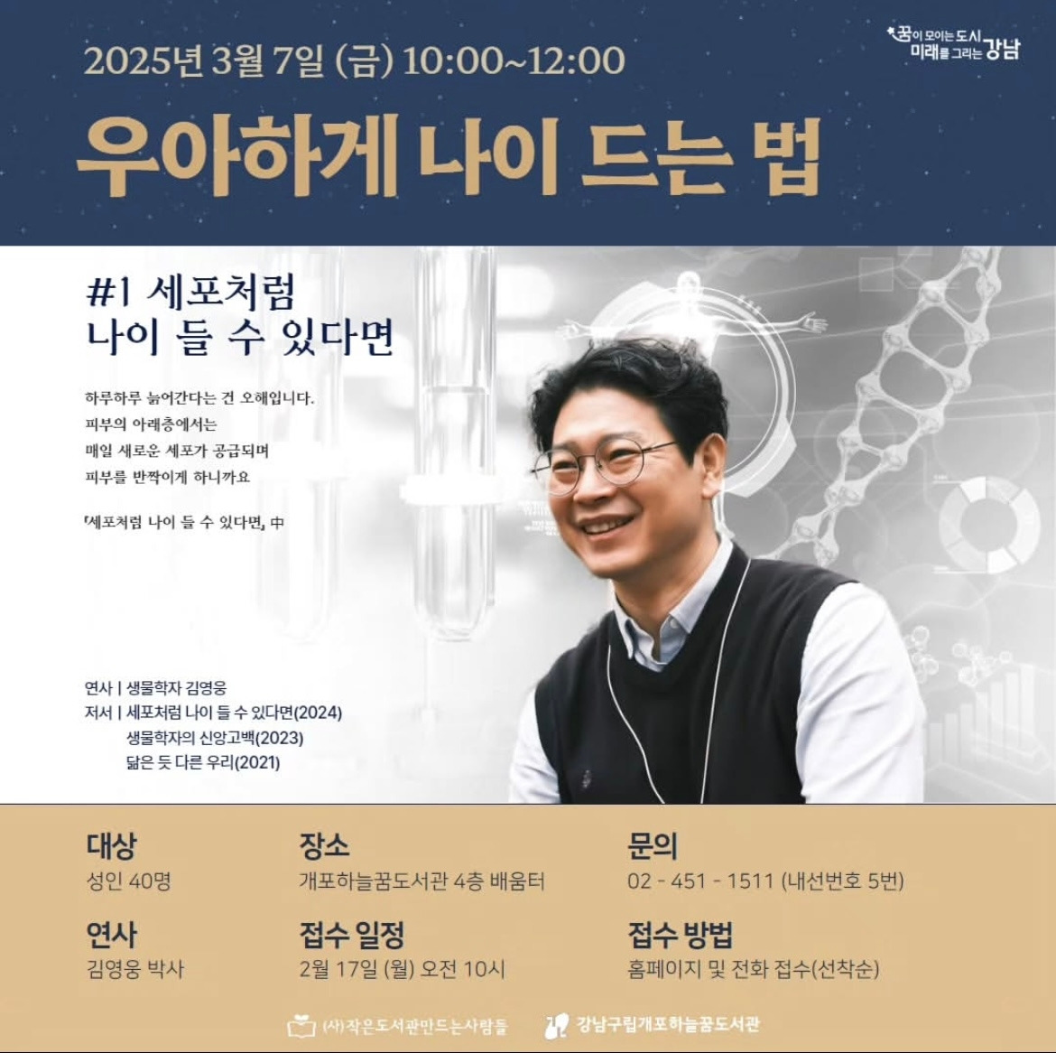 ‘세포처럼 나이 들 수 있다면‘으로 하는 첫 강연입니다. 2025년 3월 7일 금요일 오전 10-12시 서울 개포하늘꿈도서관 4층 배움터에서 열립니다. 2월 17일, 그러니까 다음 주 월요일부터 40명 선착순 마감이라고 하네요. 홈페이지 및 전화로 접수가 가능하다고 합니다. 시간 가능하신 분들은 뵐 수 있으면 좋겠습니다.