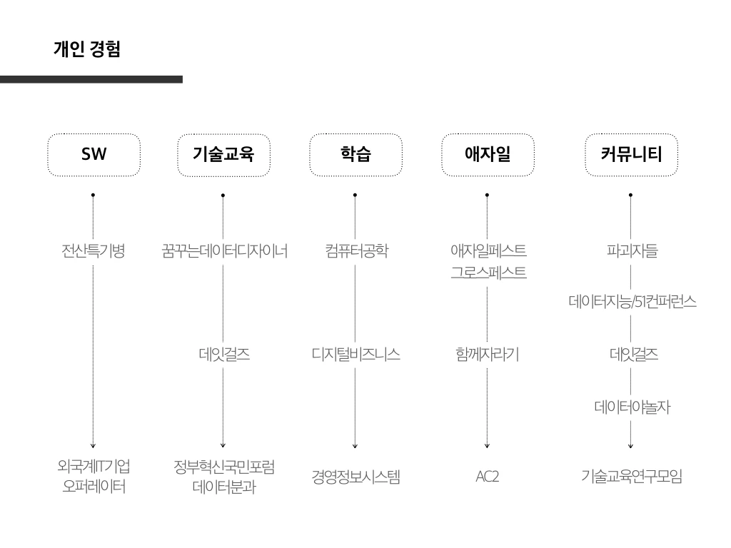 지난 3년동안 SW 여성인재 양성 사업 전체의 실질적인 PM 으로 교육/행사에 대한 컨셉 기획 및 조율과 파트너십 구축을 담당했습니다. 특히 데이터 분석 과정인 데잇걸즈의 정체성과 브랜드를 만들어 컨셉 기반의 교육을 운영했습니다. 최근에는 AC2 과정에서 학습과 코칭을 집중적으로 학습하고 있습니다.