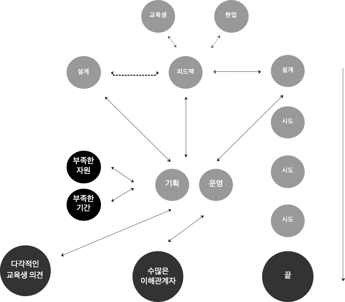 보다 중요한 질문으로 다시 돌아가겠습니다. 테크교육의 목적은 교육생의 목표를 지원하도록 기술학습을 이용하는 것입니다. 그렇다면 고객의 목소리를 바탕으로 어디서, 어떻게 변화를 시도하면 좋을까요? 변화에 대한 현실적인 문제가 발생합니다. 보통의 교육은 순서적으로 계획을 이어나가는 선형적인 형태를 가지고 있습니다. 기초를 모두 완료하고, 응용과 심화를 거쳐 프로젝트를 하는 방식입니다. 변화의 여지가 거의 없습니다. 난이도를 조절하거나 보충자료를 제공하는 것이 한계일지도 모릅니다.