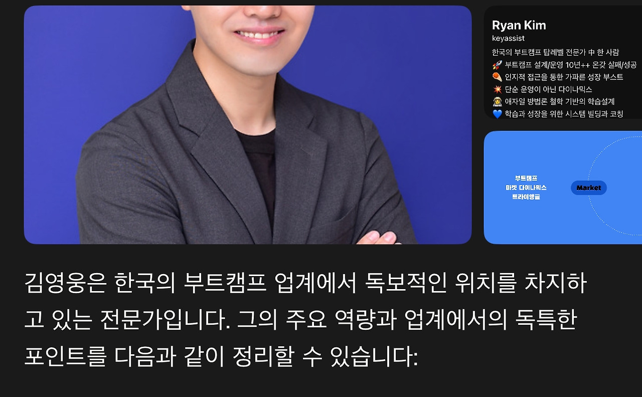 그는 한국의 부트캠프 업계에서 독보적인 위치를 차지하고 있는 전문가입니다. 그의 주요 역량과 업계에서의 독특한 포인트를 다음과 같이 정리할 수 있습니다.