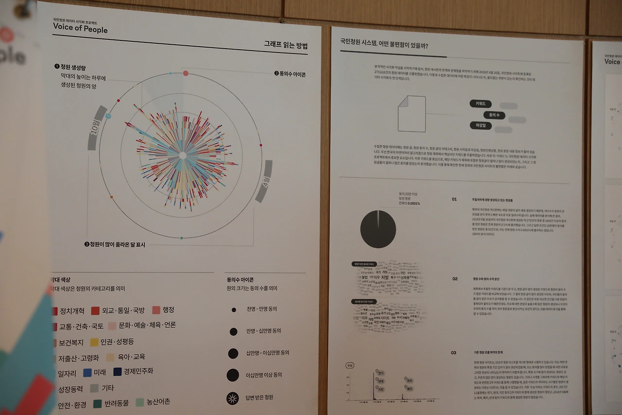 많은 발표와 포스터 세션을 참관했습니다. 그 중에서 가장 인상깊었던 것은 <Voice of People 2018> 입니다. 국민청원에 사이트에 쌓여있는 30만건 이상의 청원 데이터를 수집하고, 이를 분석하여 시각화 하는 프로젝트입니다. 홍익대학교 시각디자인학과 학부생들이 만들었는데, d3.js 라이브러리를 이용하여 직관과 인터랙티브의 균형을 매우 잘 맞춘 사이트로 결과물을 도출했습니다. 작년에 기획, 운영했던 프로그램에서도 국민청원 데이터를 이용한 프로젝트를 했었는데, 그 덕분에 유심히 관찰하고 질문을 했습니다. 매우 차분하고 깊이있는 답변을 들을 수 있었는데, 짧은 기간에도 불구하고 높은 완성도를 만들어낸 팀의 역량이 돋보이는 시간이었습니다. 사이트는 voiceofpeople.kr/ 입니다.