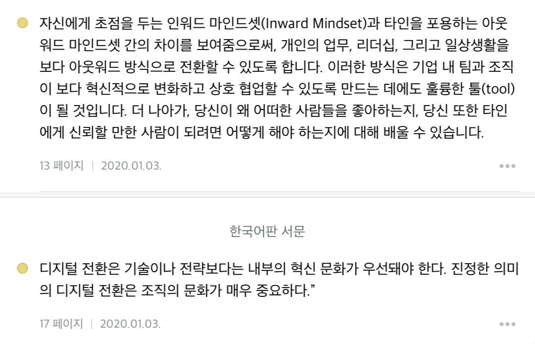 마인드셋의 변화로도 사실 충분하지 않다. 변화가 지속되려면 소위 ‘아하’ 라고 일컬어지는 변화의 순간이 반복되어야 하며, 남의 이야이가 아니라 나의 일과 삶의 변화를 가져오는 일의 개선이 있어야 한다. 선포되는 변화가 아니라 지속적으로 일과 삶에서 진행되며 피드백을 통해 개선이 누적되는 축적형 혁신으로 진화해야 한다. 이는 개인의 의지와 조직의 의지 어느 한 방향의 일방적인 주도로 이루어질 수 없고, 의지를 뒷받침하는 시스템이 설계되어야 한다.