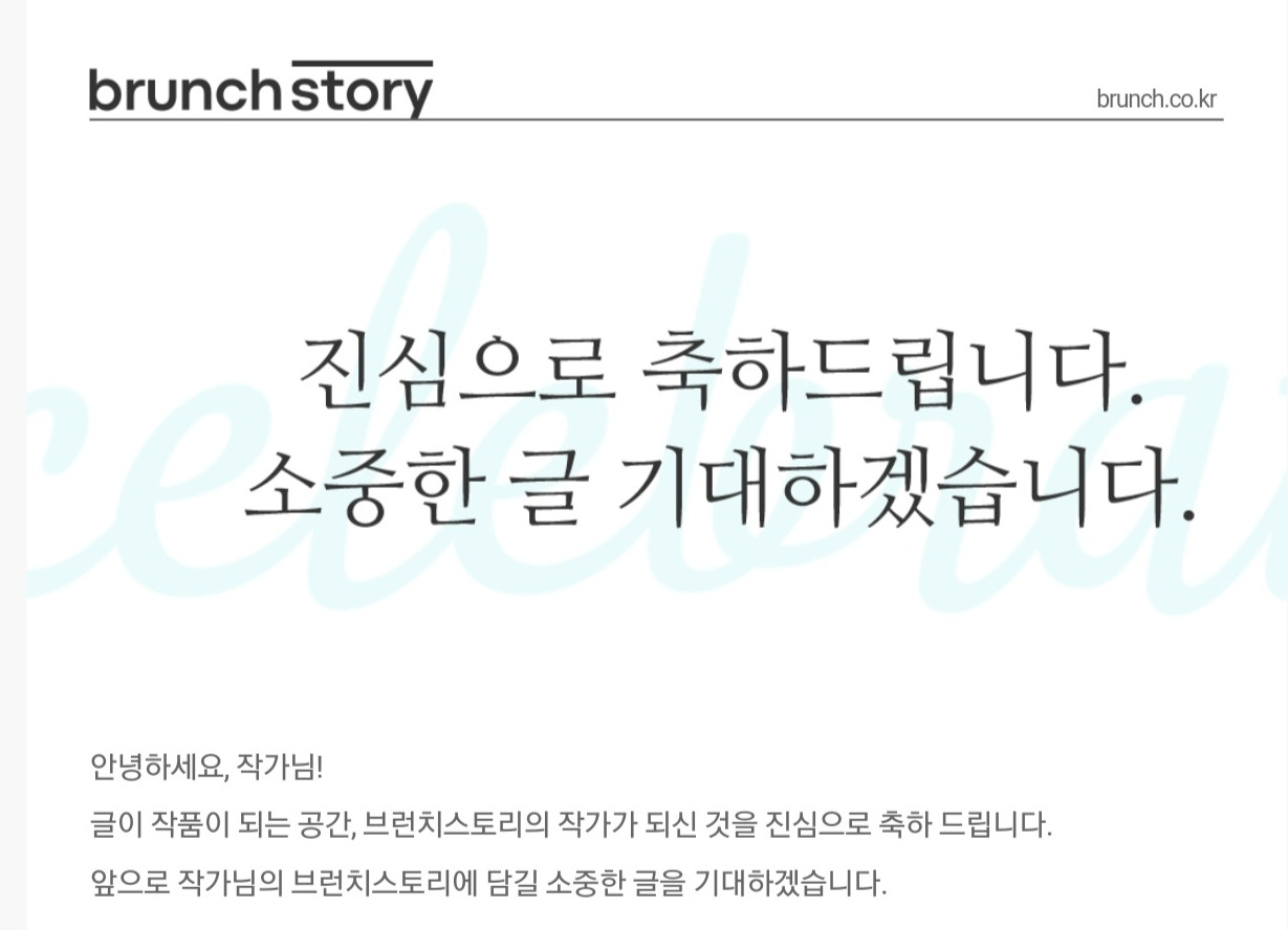 "브런치 스토리의 작가가 되신 것을 진심으로 축하드립니다. 앞으로도 작가님의 소중한 글 기대하겠습니다."드디어 기다리던 소식이 도착했다.