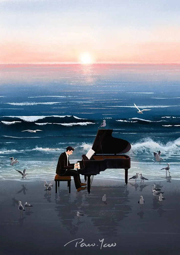 그의 손끝에서 은빛처럼 맑은 음이 튀어 오르고, 그 사이사이—작고 또렷한 종소리가 울린다.