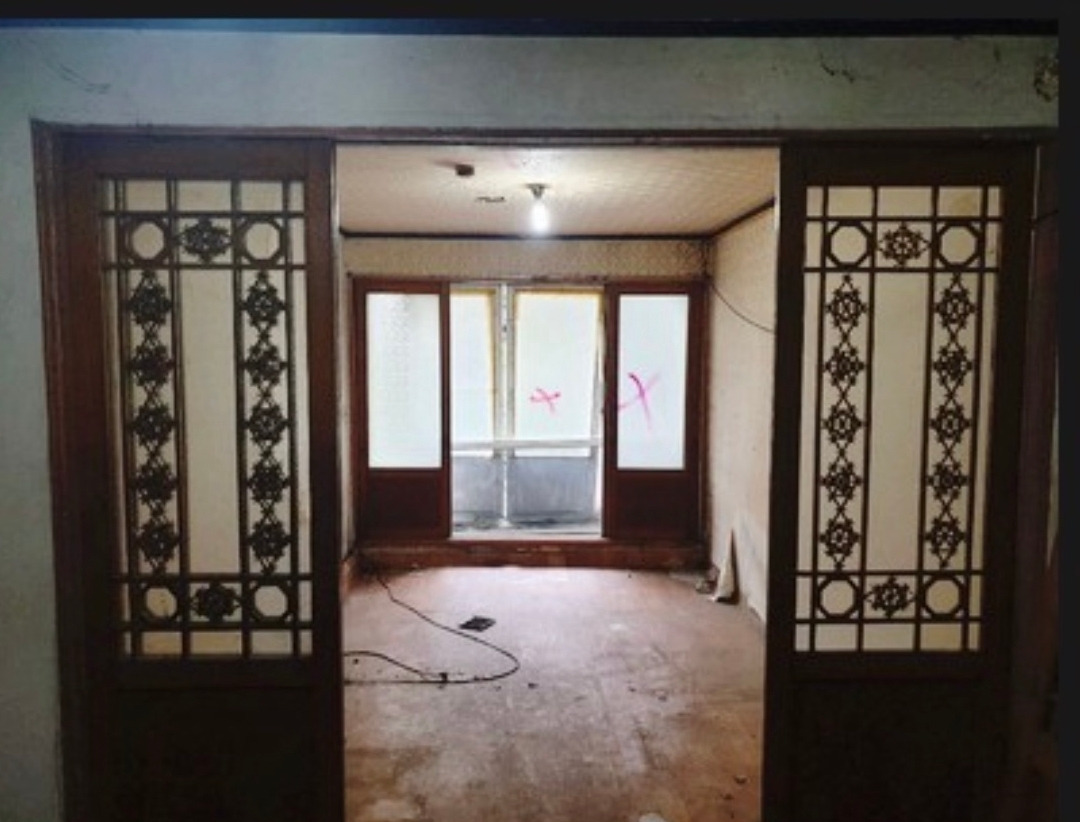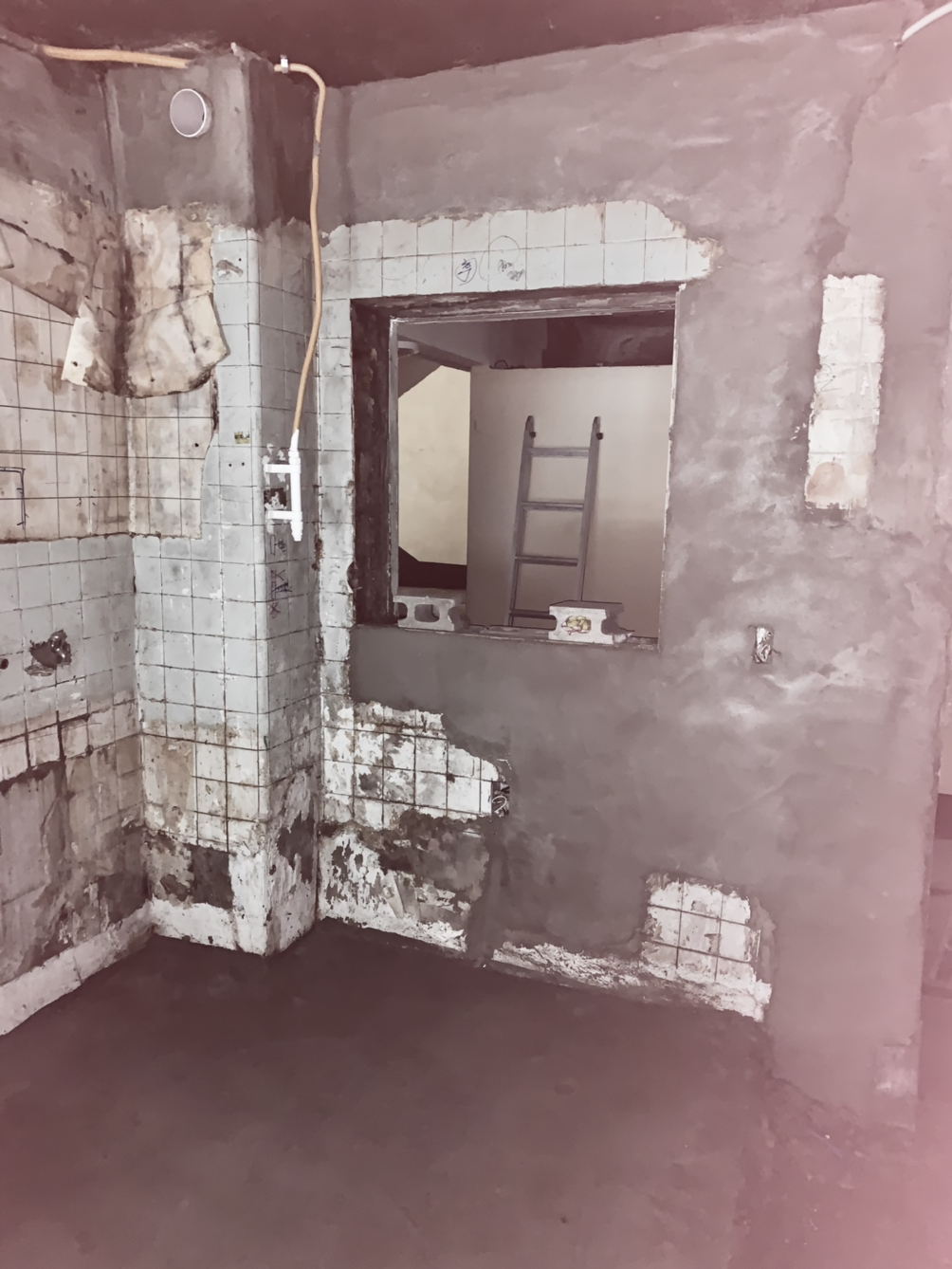 현관과 주방을 분리하는 가벽을 세워서 입구에서 주방 동선에 길을 만들었다. 집이 현관입구쪽은 지하이지만 집안에 들어가 베란다쪽은 지상으로 지어진 구조이다. 그래서 복도쪽에 붙어있는 주방과 작은방은 환기에 취약하기때문 곰팡이에 항상 노출이 되어있다. 창문이 있지만 욕실의 윗집 누수까지 겹쳐 한쪽벽은 손으로 시멘트가 부서질 정도로 결로가 너무 심하게 되었다.
