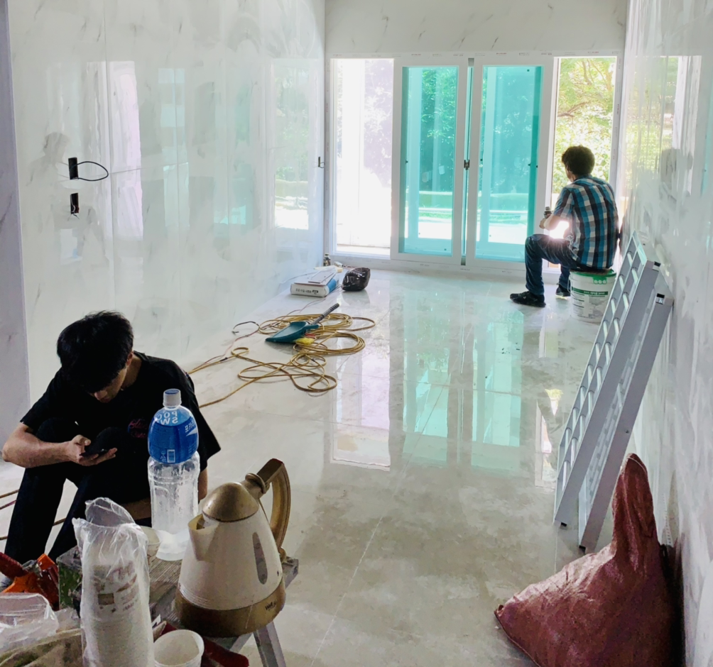 이집이 재건축에 개발지역으로 되기까지는 시간이 걸릴꺼라 판단하고 10년 정도는 쾌적하게 살게끔 튼튼하게 공사를 해야한다는 기준을 잡고 마루보다 바닥과 벽을 전부 습기에 강한 타일로 깔기로 했다. 방이 두개인데 욕실과 접한 예전 곰팡이에 노출되었던 벽 한면도 타일로 하기로 결정했다. 타일자재를 싸게 살수있는 공장을 소개받아 알게되어 집안의 분위기 상 화이트 컨셉으로 바닥과 벽, 욕실, 현관, 주방벽, 베란다, 테라스를 하나씩 고민해서 골랐다.