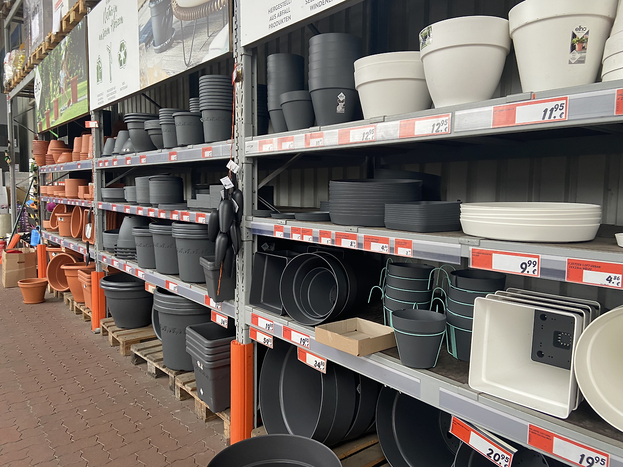 드디어 민트를 사고 셋째 날, 나는 독일에 와서 처음으로 말로만 듣던 BAUHAUS를 찾아갔고, 들어가는 입구부터 눈이 돌아가기 시작했다. 입구부터 식물들은 뭐가 그리 많은 것이며, 시기가 시기여서 그런지 크리스마스트리도 정말 많고, 전동드릴의 종류가 이렇게 많은 줄도 몰랐으며, 집 공사를 할 때 쓰이는 타일, 페인트, 벽지, 전등, 샤워 시설, 잔디, 잔디 깎는 기계, 등 정말 없는 게 없는 철물점의 이케아 같았다. 화분이 있는 코너를 찾기까지도 시간이 걸렸지만, 독일은 집 안의 바닥이 나무 혹은 카페트인 경우가 많아서 그런지 겨우 찾은 화분들은 다 구멍이 안 뚫려 있었다. 화분에 구멍이 안 뚫린 것은 주로 수중 식물이나 조화 등에 사용이 되는 것이어서 그냥 식물을 구멍 없는 화분에 키워버리면 물이 빠지지 않아 썩어서 죽거나 함으로 화분에 구멍이 없다면 직접 뚫어야 한다는 말을 어디서 본 기억이 있어 다시 구멍 뚫린 화분을 찾으러 다녔다. 나는 분명 건물 안으로 들어와 돌아다니고 구경하였는데 어느샌가 야외에 전시된 코너가 나와서 눈이 휘둥그레 졌다. 미어캣처럼 고개를 이리저리 움직이며 돌아보다 드디어 찾았다. 이 곳이야 말로 발코니나 외부에서 키우는 식물 용 화분들이 즐비해 있었다. 외부에서 사용하는 화분들에는 다행히 구멍이 뻥뻥 뚫려 있어 마음속으로 환호성을 지르며 마음에 드는 화분을 찾느라 요리조리 잘도 다녔던 것 같다. 집 안에서 사용하는 구멍이 없는 화분은 이쁜 것도 많은 것 같은데, 집 밖에서 사용하는 구멍 뚫린 화분은 생각보다 이쁜 디자인이 없어 조금 아쉬웠지만 마지막에 그래도 마음에 드는 깔끔한 화분을 발견하여 두 개를 냉큼 집어 카트에 넣었다. 그 뒤 또 흙을 찾으러 다니는 여정이 시작되었지만.
