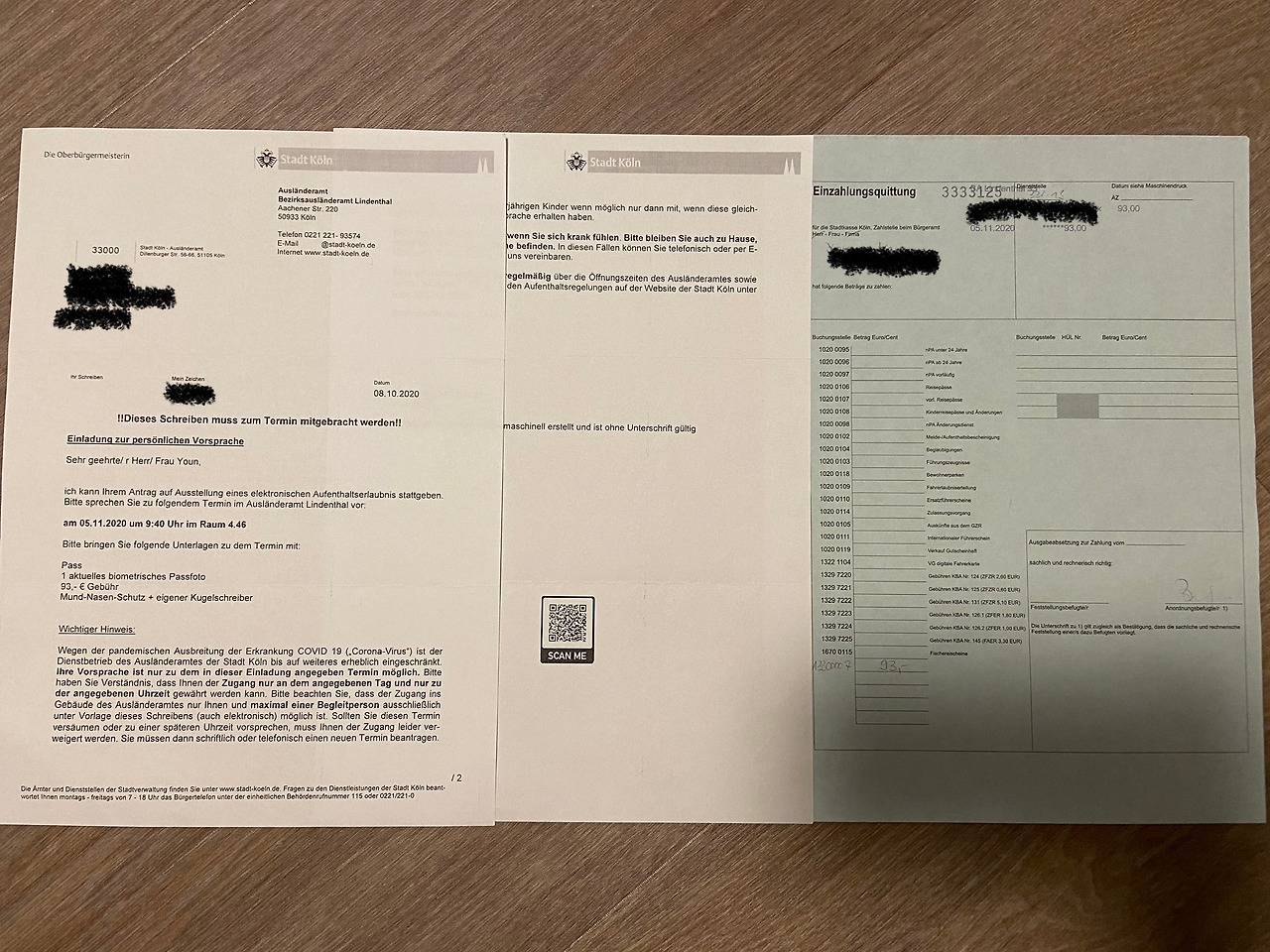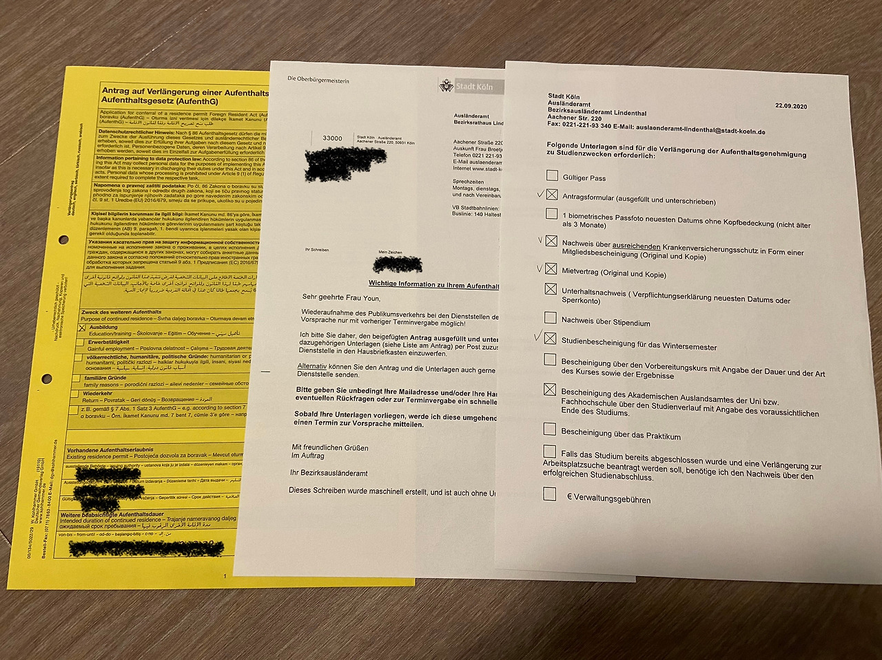 2019년 12월부터 1년간 유효한 유학비자를 받은 직후 COVID-19 사태가 벌어져 한국으로 잠시 돌아갔다가, 아직 바이러스와 관련하여 아무런 상황 해결이 되지 않은 9월에 다시 독일로 돌아온 이유 중의 하나는 비자 연장이었다. 그렇기에 9월에 돌아오자마자 비자 연장을 위해서 필요한 서류를 미리 조금씩 준비를 하고 있었는데, 9월 중순 경, 집으로 비자 연장 신청서 및 필요한 서류들이 적힌 우편물이 날아왔다. 약속은 어떻게 잡아야 하고, 신청서는 어떻게 구해야 하는지 모든 게 막막하던 차에 우편물을 받았기에 이게 얼마나 반갑던지. 다행히 유학 비자의 연장을 위한 필요 서류는 처음에 비자를 받을 때와 별반 다른 게 없었다.