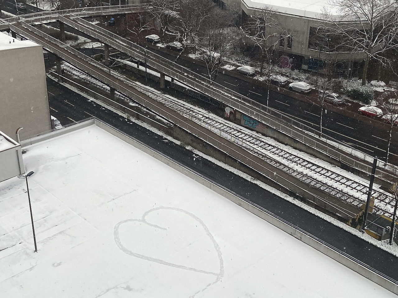 오전 11시가 조금 넘을 무렵, 갑자기 창밖에 아주 굵은 눈송이들이 펑펑 쏟아져 내리기 시작했다. 나는 깜짝 놀라 부랴부랴 발코니로 나가 사진과 동영상을 열심히 찍었다. 휴대폰 사진으로도 눈이 내리는 것이 찍힐 정도였으니 정말 큰 눈들이었다. 이런 깜짝 선물을 내려주다니! 하지만 여기서는 눈도 비처럼 내리나 보다. 3분, 4분 정도 내리더니 정말 신기할 정도로 눈은 그쳐버렸고 몇 시간도 되지 않아 눈은 모두 녹아버렸다. 요즘 무기력함에 매일 밍기적거리던 나였기에, 짧은 시간에 펑펑 내리던 눈을 놓치지 않고 일어나 사진과 동영상으로 남기며 즐겼다는 것만으로도 아주 큰 뿌듯함이 밀려왔다. 한국에서처럼 눈사람을 만들거나 눈싸움을 하거나 혹은 조용히 뽀드득 소리 나는 눈 위를 밟는 일들을 하지 못 하였지만 지붕 위에 쌓인 눈과 주차장에 세겨진 하트 모양의 눈으로 내 마음은 조금 활기를 되찾은 것 같다.