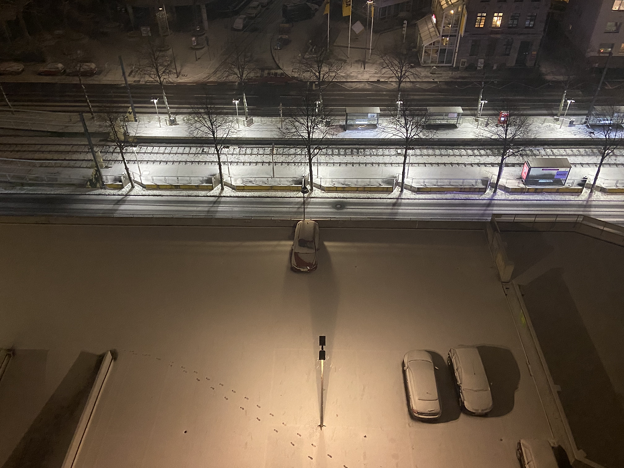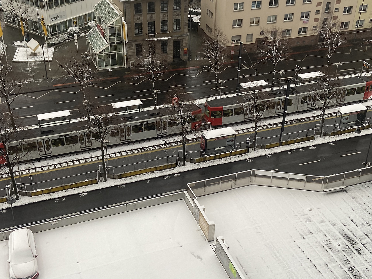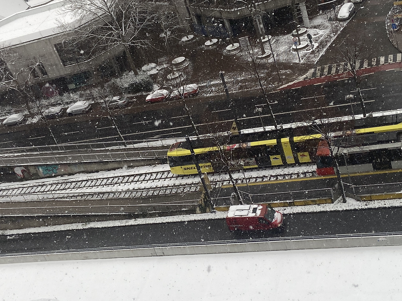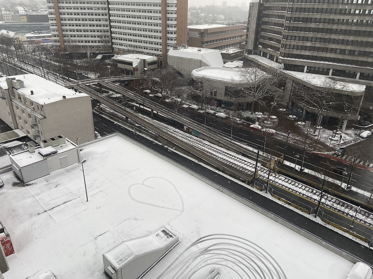 그랬던 것이다. 나는 침대에 누워 어두워진 창 밖은 볼 생각도 안 하고 밖에 눈이 내리는 줄도 모른 채 그저 절망감에 휩싸였던 것이었다. 눈이 가진 힘은 정말 무시무시했다. 나를 침대에서 바로 나오게 하여 발코니로 향하게 하였으니 말이다. 내 눈 앞의 풍경은 내가 그토록 보고 싶었던 흰 눈으로 쌓인 지붕들이었다. 매번 날씨 예보에서 눈이 온다고 하여도 비나 비가 섞인 눈이 내려 볼 수 없었던 풍경이어서 작년 2월에 간 눈이 펑펑 쏟아진 할슈타트는 꿈의 나라인 듯했는데 드디어 다시 내 눈 앞에 설경이 펼쳐진 것이었다. 갑자기 발 밑의 주차장에 있는 발자국들이 귀여워 보였고 매일 보던 트램마저 새로워 보였다. 금방이라도 녹을 것 같은 눈이었기에 내일 아침에 다시 이 모습을 볼 수 있을까, 지붕 위에 만이라도 눈이 남아 있으면 좋겠다, 생각만 하며 잠에 다시 든 것 같다.