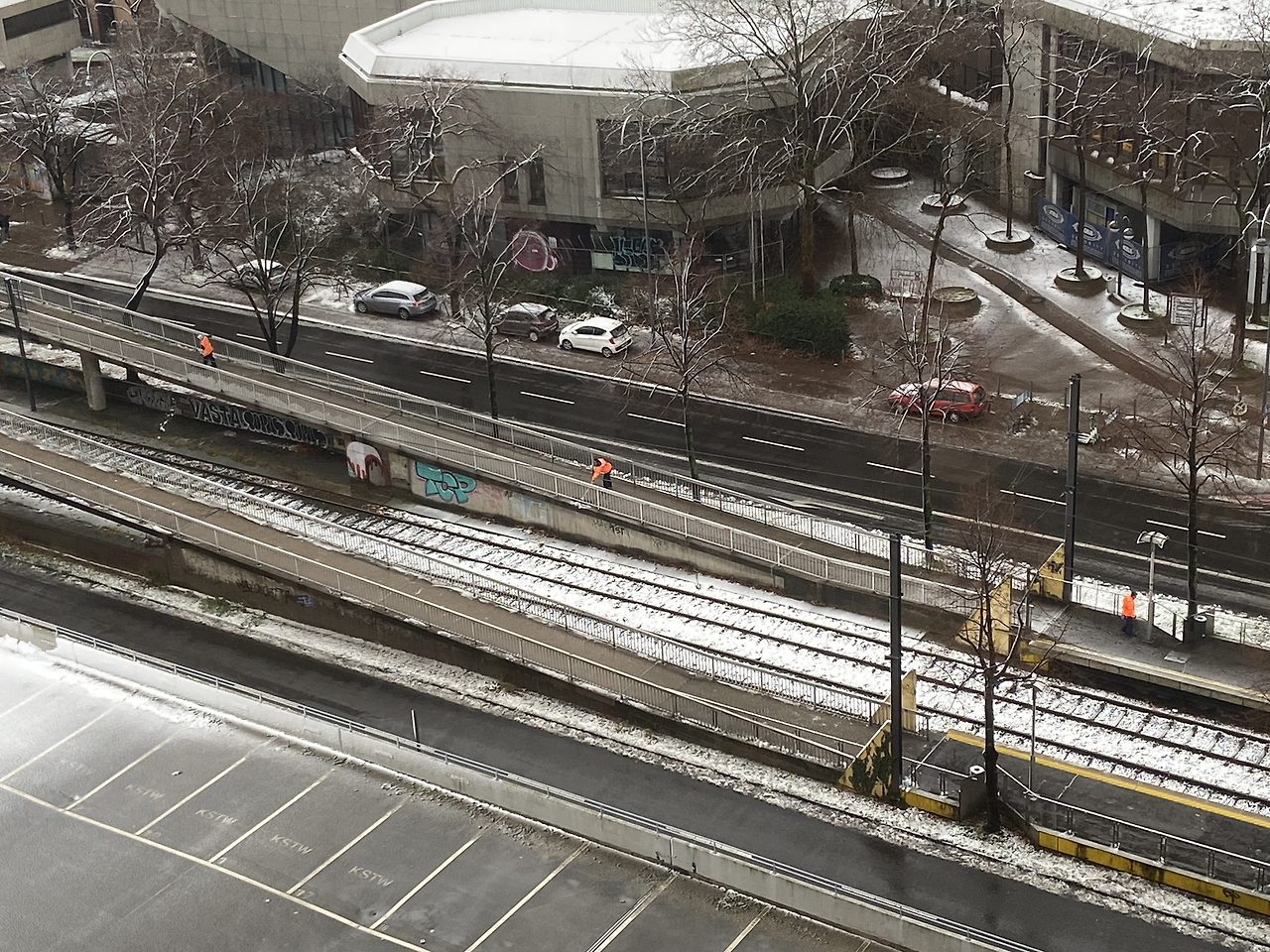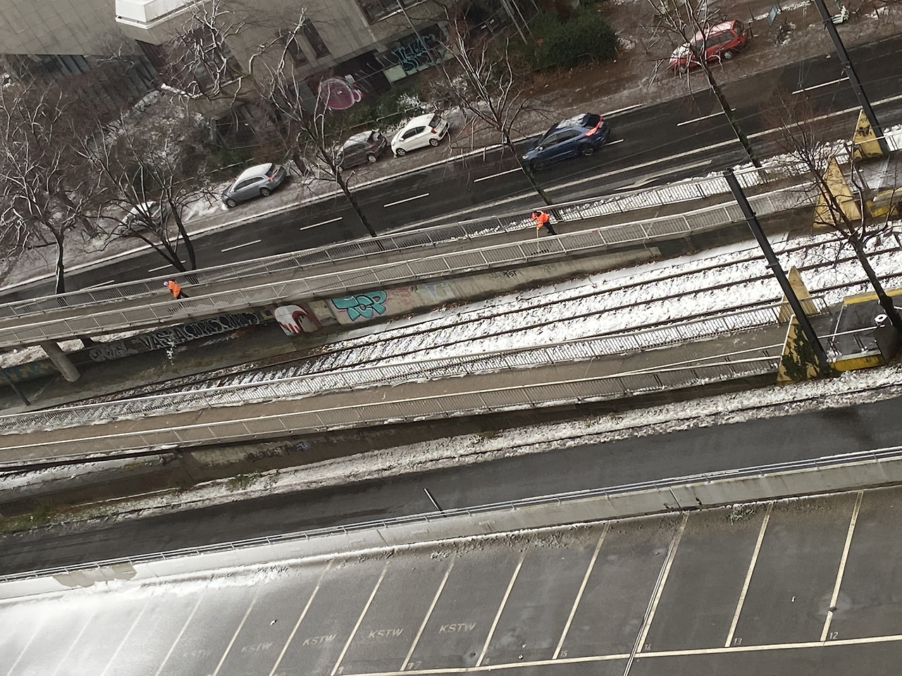 그리고 오늘 아침, 눈을 떠보니 밤새 눈이 잠시 내렸었나 보다. 발코니로 나가 밖을 내려다보는데 조금 쌓여 있는 트램 길 주변의 눈을 청소하시는 분들의 모습이 보였다. 주황색 형광 옷을 입고 있어서 그런지, 아니면 그분들이 빗자루로 눈을 쓸어 내는 소리가 11층인 내 집까지 들려 왔고 그 소리가 썩 나쁘지 않았어서 그런지 나는 한동안 멍하니 눈 청소를 하시는 분들을 보고 있었다. 그러다 깨달은 것이, 이 분들 또한 서로 간의 거리를 지키며 눈을 쓸어 담고 있다는 것이었다. 눈을 쓸면서도 각자의 거리를 체크하며 일정한 간격을 유지한 채 일을 한다니, 뭔가 우스꽝스러웠지만 한편으로는 그만큼 COVID-19 사태가 길어짐에 따라 새로 몸에 베인, 거리두기가 우리 삶의 하나의 습관이 되어 버린 것 같아 마음이 울적해졌다.