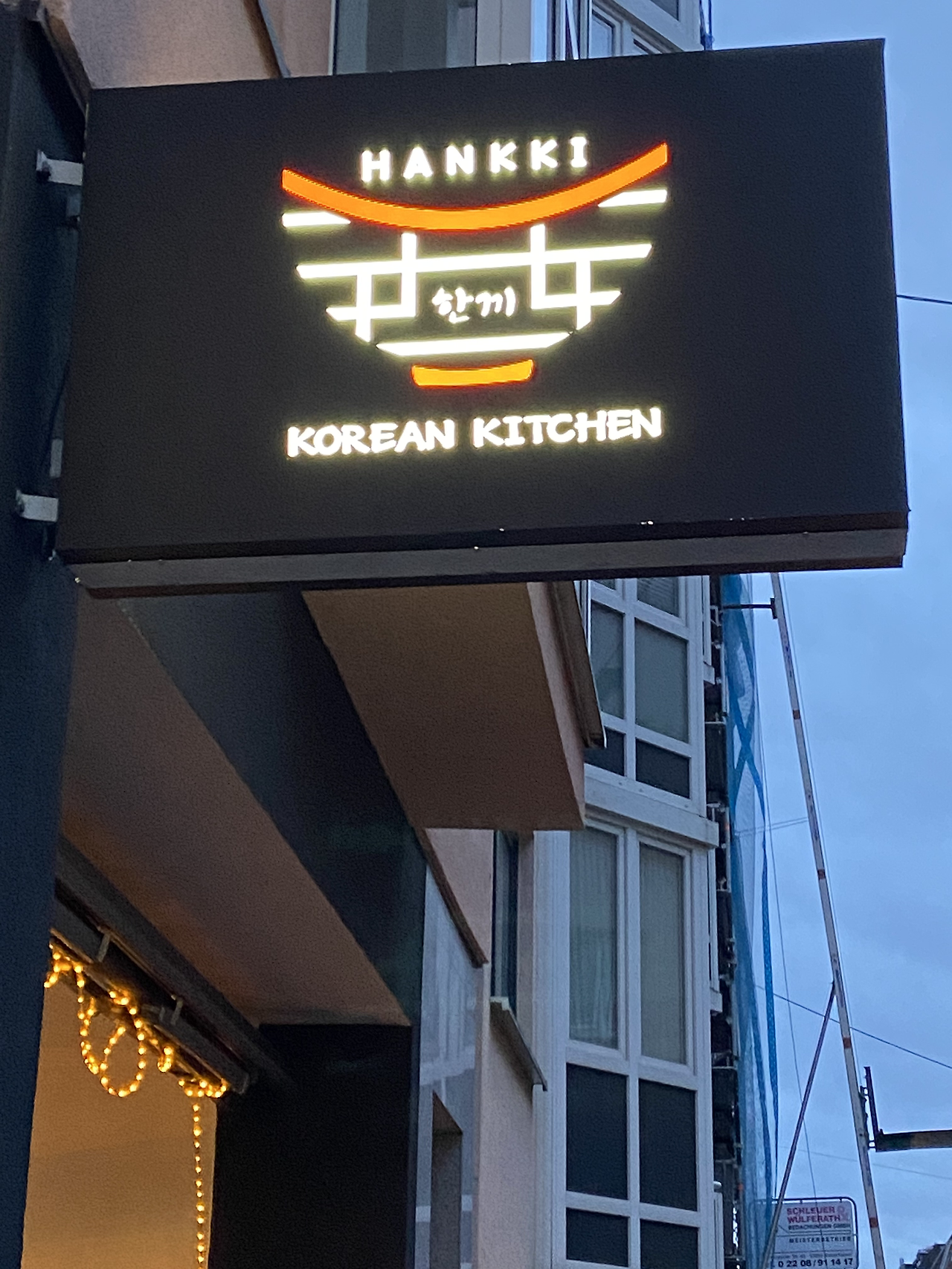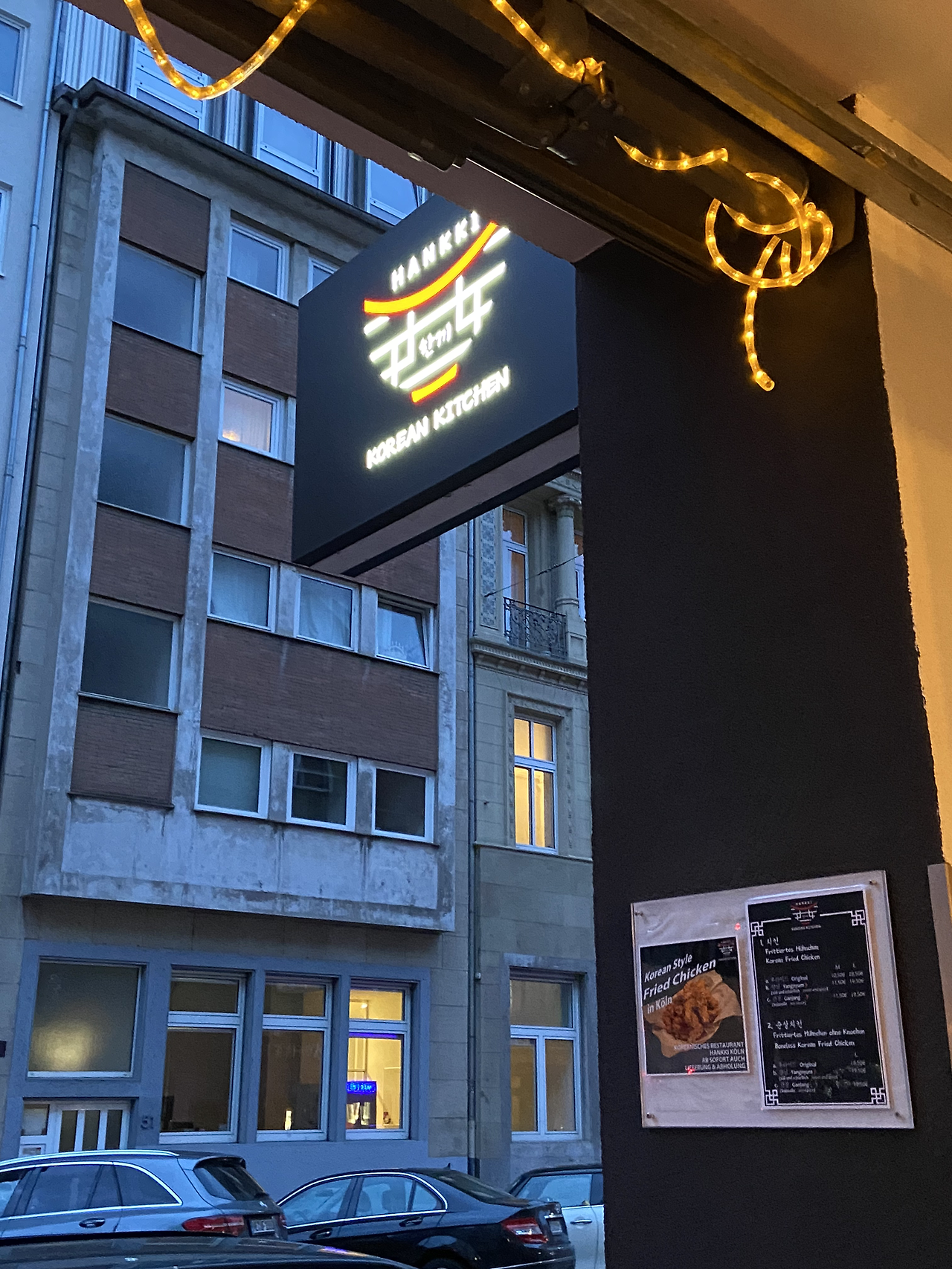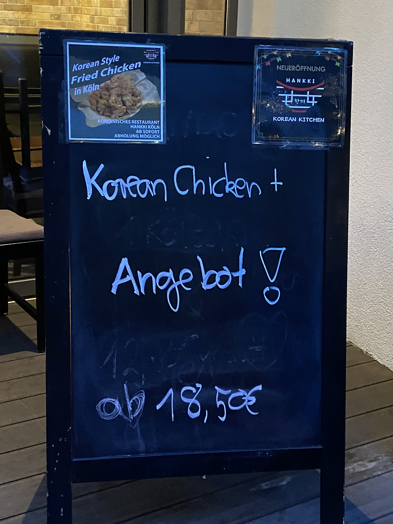 그렇게 버블티를 마시며 도착한 치킨집 Hankki. 새로 오픈하여서 그런지 가게 안은 아주 깨끗하였고, 치킨집임에도 기름 냄새보다는 치킨 무 냄새가 더 나는 것 같았다. 사장님과 사장님의 어머니로 보이는 분 (아니면 죄송합니다!), 이렇게 두 분이 계셨는데 두 분 모두 인상도 좋으시고 정말 친절하게 대해 주셔서 가게에 머무르는 동안 편하게 있을 수 있었다. 메뉴는 후라이드, 양념, 간장으로 M 사이즈와 L 사이즈가 있었고, M 사이즈는 반마리, L 사이즈는 한 마리라고 하셨다. 우리는 후라이드와 양념 반반 (19.50 유료)을 시켰고, 20분에서 25분 정도가 걸린다고 하셔서 가게 밖에 놓여 있는 의자에 앉아서 이야기를 나누며 시간을 보내었다. 지난주에 갑자기 추워졌다가 다시 따뜻해진 날씨 덕분에 밖에 있어도 그다지 춥지 않아서 편하게 기다리며 우리는 한국식 치킨을 맞이할 준비를 하였다. Lieferando 어플로도 주문을 할 수 있다고 하셨는데 어플로 주문을 하면 좀 더 비싸고, 같은 쾰른이지만 어플에서 이용이 가능한 지역과 가능하니 않은 지역이 있다고 말씀해주셨다. 친구네 집도, 나의 집도 트램을 타면 20분 정도 걸리고 차로는 10분도 채 되지 않는 거리임에도 둘 다 어플에 가게가 나오지 않아 아직 어플로 주문은 불가능한가 보다, 하고 기다리고 있었는데 그게 아니었다. 우리가 살고 있는 지역은 이용이 불가한 지역이었던 것이다. 대신 전화를 하고 찾으러 오면 기다리지 않고 바로 받아 가실 수 있다고 알려주셔서 다음부터는 전화를 미리 해야겠다 싶었다.