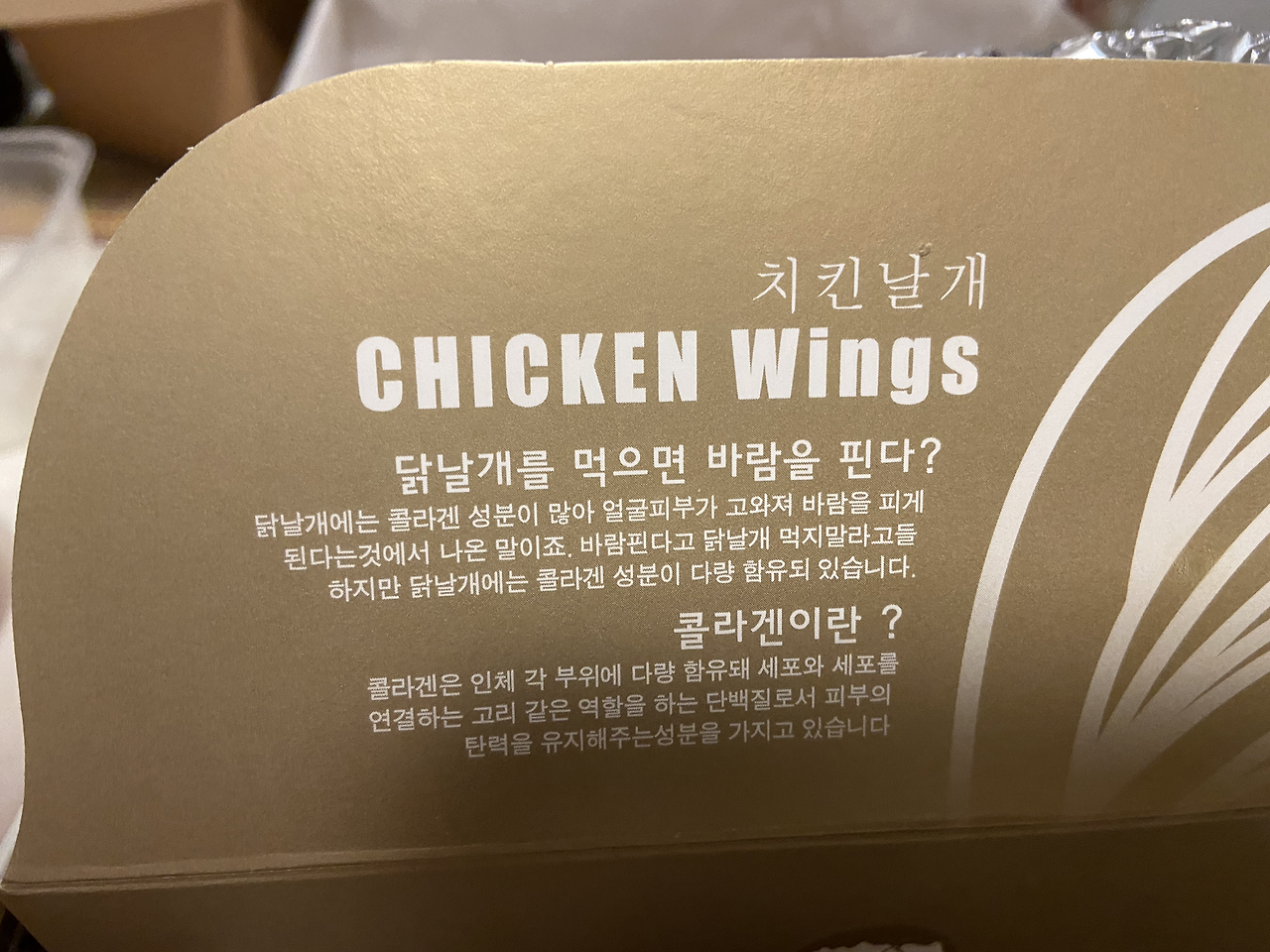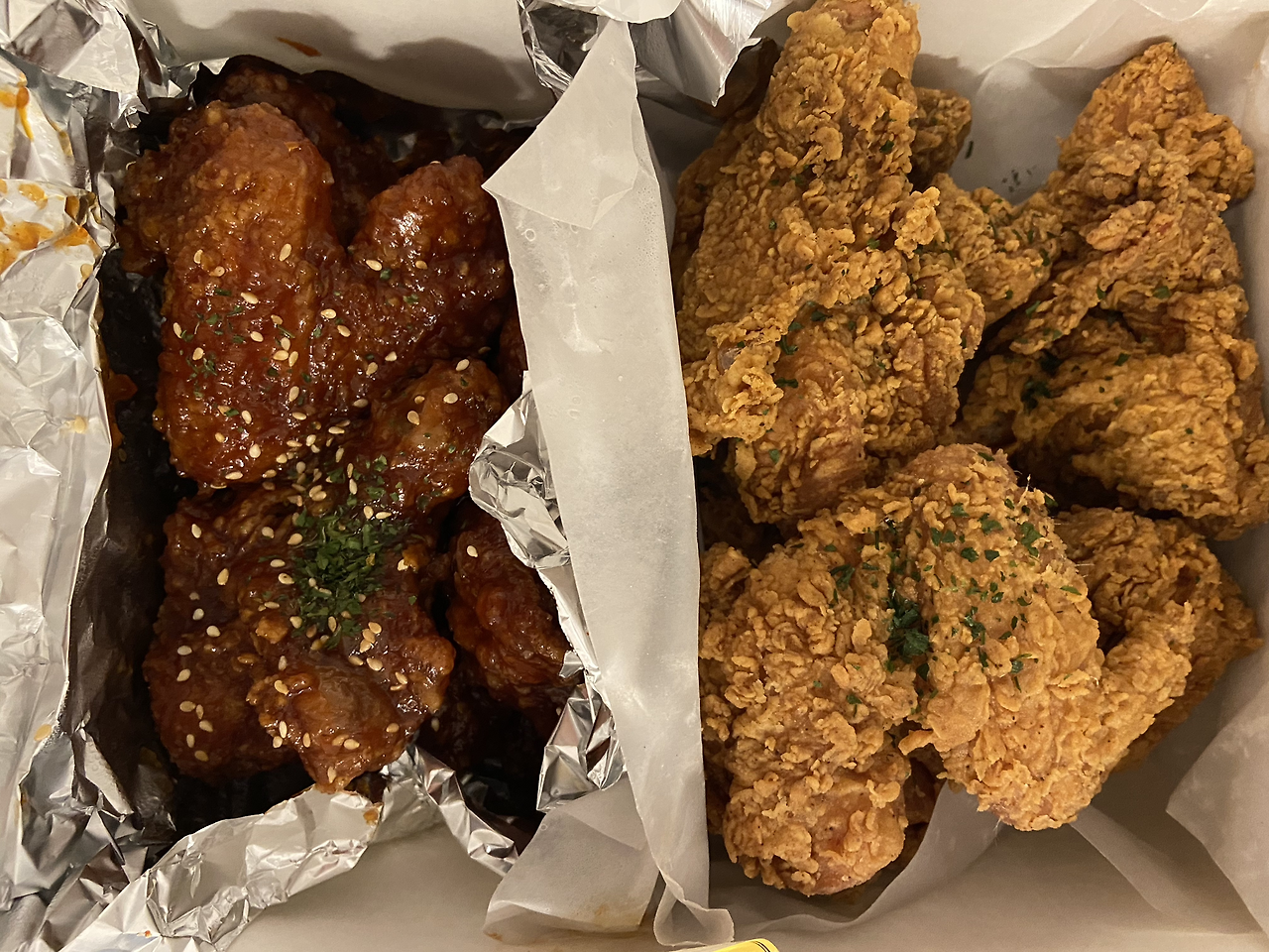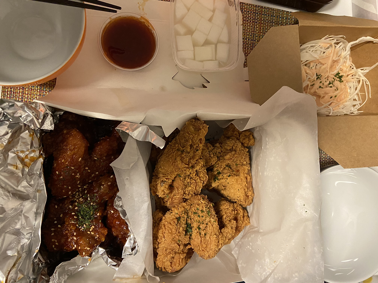 집에 도착하자마자 손을 씻고 세팅을 하고 주저하지 않고 바로 닭다리를 집어 먹었다. 한국 치킨집에서 주시는 샐러드와 함께 치킨 무도 따로 돈을 받지 않고 양념과 소금까지 함께 들어 있는 센스에 감탄을 하지 않을 수가 없었다. 당연한 이야기이겠지만 KFC보다 맛있었고, 후라이드도 양념도 치킨의 간을 이 가게의 특별한 비법으로 하시는지 독특한 맛이 났다. 특히 양념치킨에는 춘장 느낌의 맛도 돌아서 특이하였다. 독일인의 입맛에 맞추기 위해서인지 내 입에는 조금 짠 느낌이 있었지만 그래도 오랜만에 먹는 바삭한 한국식 치킨에 우리는 배부르고 알차게 잘 먹을 수 있었다. 치킨을 먹으면서도 하루빨리 락다운이 풀려 치킨집에서 갓 튀긴 치킨을 앞에 두고 가게의 온 사방에 들러붙은 기름 냄새를 가득 맡으며 가게에서 치킨을 먹을 수 있는 날이 왔으면 좋겠다는 생각이 들었다. 인자하신 인상으로 정말 친절하셨던 사장님 두 분이셨기에 더 이 가게가 번창하길 진심으로 바라며 마지막 남은 치킨 한 조각을 집어 들었다. 오늘 하루의 마무리가 치킨이었기에 더욱 뜻깊은 것 같다. 역시 운동 후에는 튀김이다.