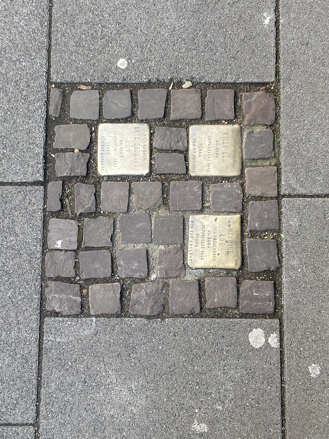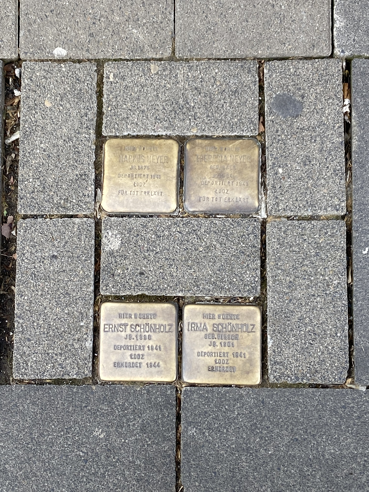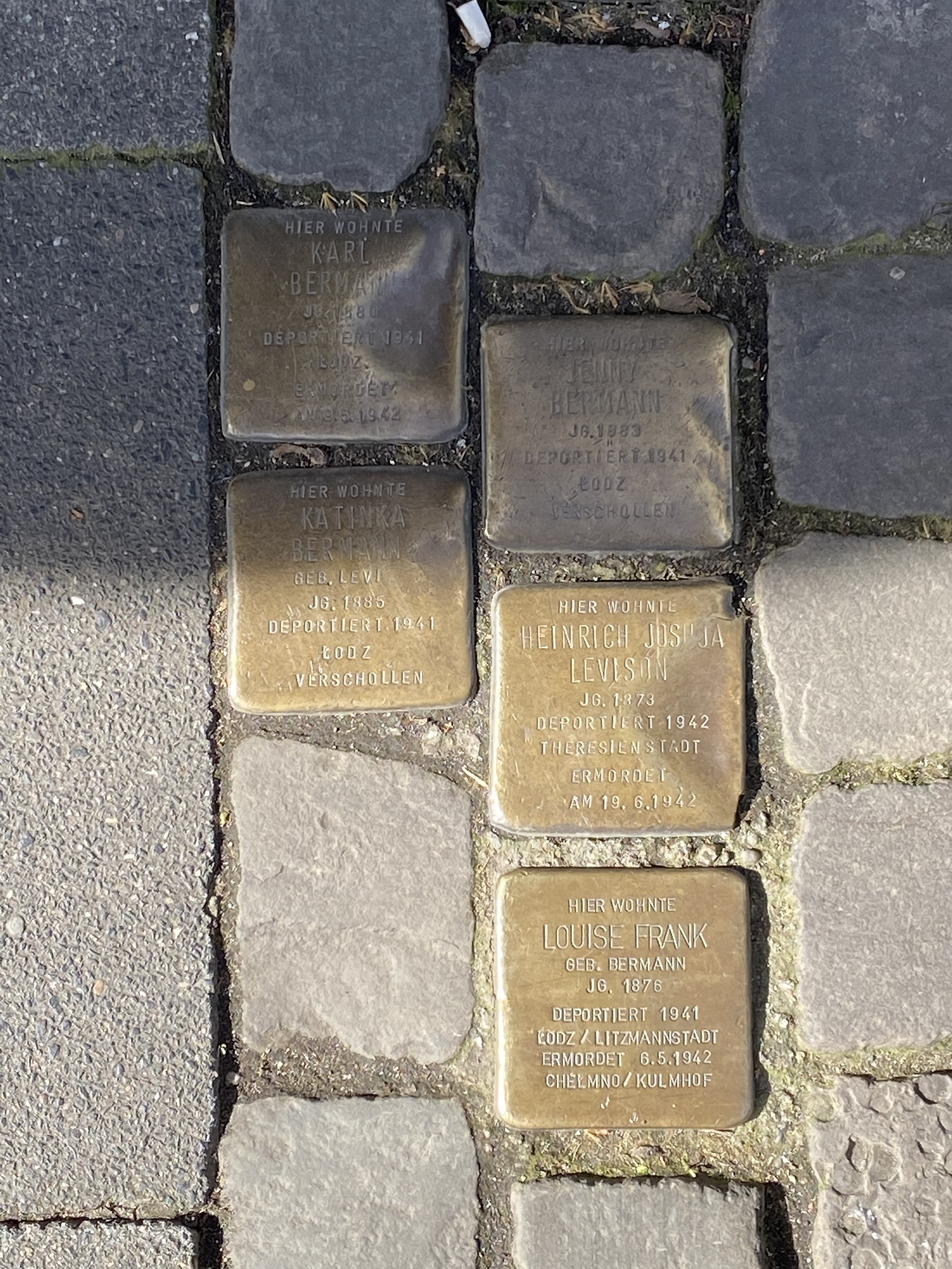 대신 사람이 북적거리지 않는 길거리를 산책 겸 천천히 걸을 때가 있는데, 걷다 보면 종종 길바닥에 반짝이는 황동판을 발견한다. 이 황동판은 아마 독일 전 지역에서 발견할 수 있지 않을까 싶은데, 그 이유는 과거에 그 자리 (그 길에 접해 있는 곳)에 살던, 나치에 의해 희생당한 유대인 혹은 집시를 추모하기 위한 것이기 때문이다. 가로 세로 10cm 크기의 이 황동판에는 희생자 분들의 이름, 출생연도 등이 새겨져 있는데, 이 황동색의 돌멩이 같은 기념물의 의미를 알고 난 후부터는 그냥 지나치기가 어렵다. 잠시라도 걸음을 멈추고 이름이라도 읽어 본다던지, 아니면 잠시라도 눈길을 주어 가벼운 목례를 하게 된다. 왠지 모르게 그 조그마한 판 안에 그분들의 행복했던 시간과 고난했던 시간 등, 그 모든 나날들이 다 담겨 있는 것 같아서다.