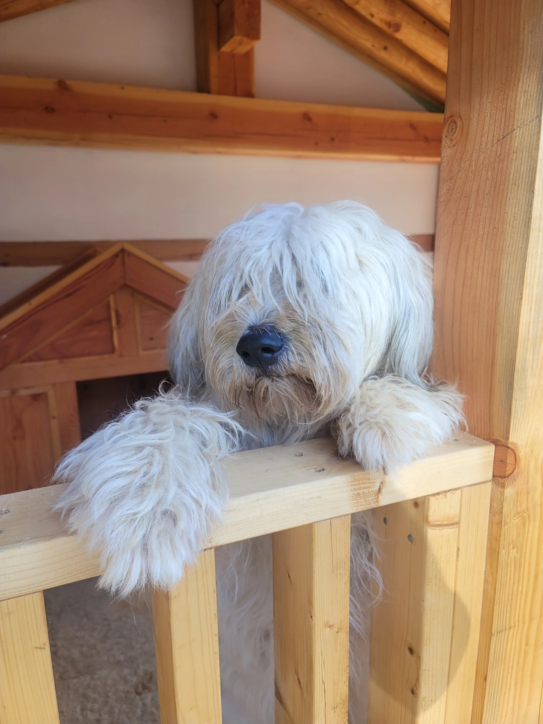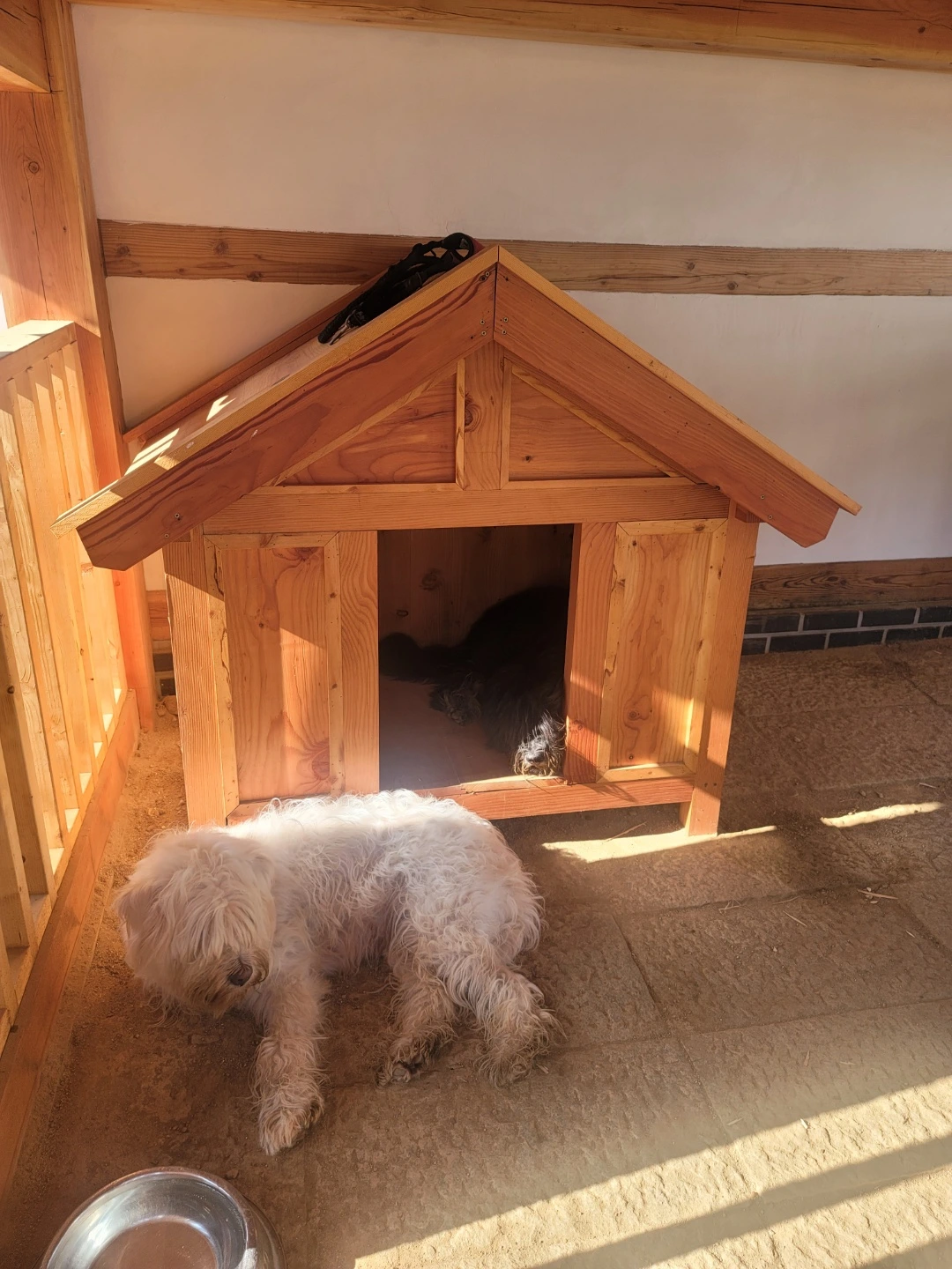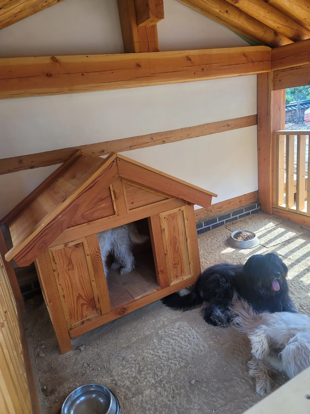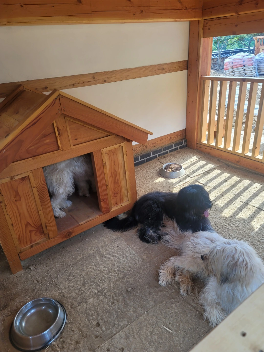오래 걸린 만큼 결과물은 아주 만족스럽고, 곰이 집의 칠을 하는 김에 우리와 두리 집도 칠을 새로 하느라 이틀 정도는 세 마리 모두 곰이 집에서 지내었다. 세 마리가 모두 들어가 있어도 한옥 옆, 기와 밑의 곰이 집은 올여름 폭염에도 끄떡없었다. 산책할 때는 그렇게 헥헥거리는 우리, 두리, 곰이도 각자의 집에서는 시원한지 헥헥거리지도 않는다. 세 마리 모두 곰이 집이 마음에 드는지 마당에서 놀다가도 곰이 집에 들어 가 두리번거리며 쉬다 오기도 한다.