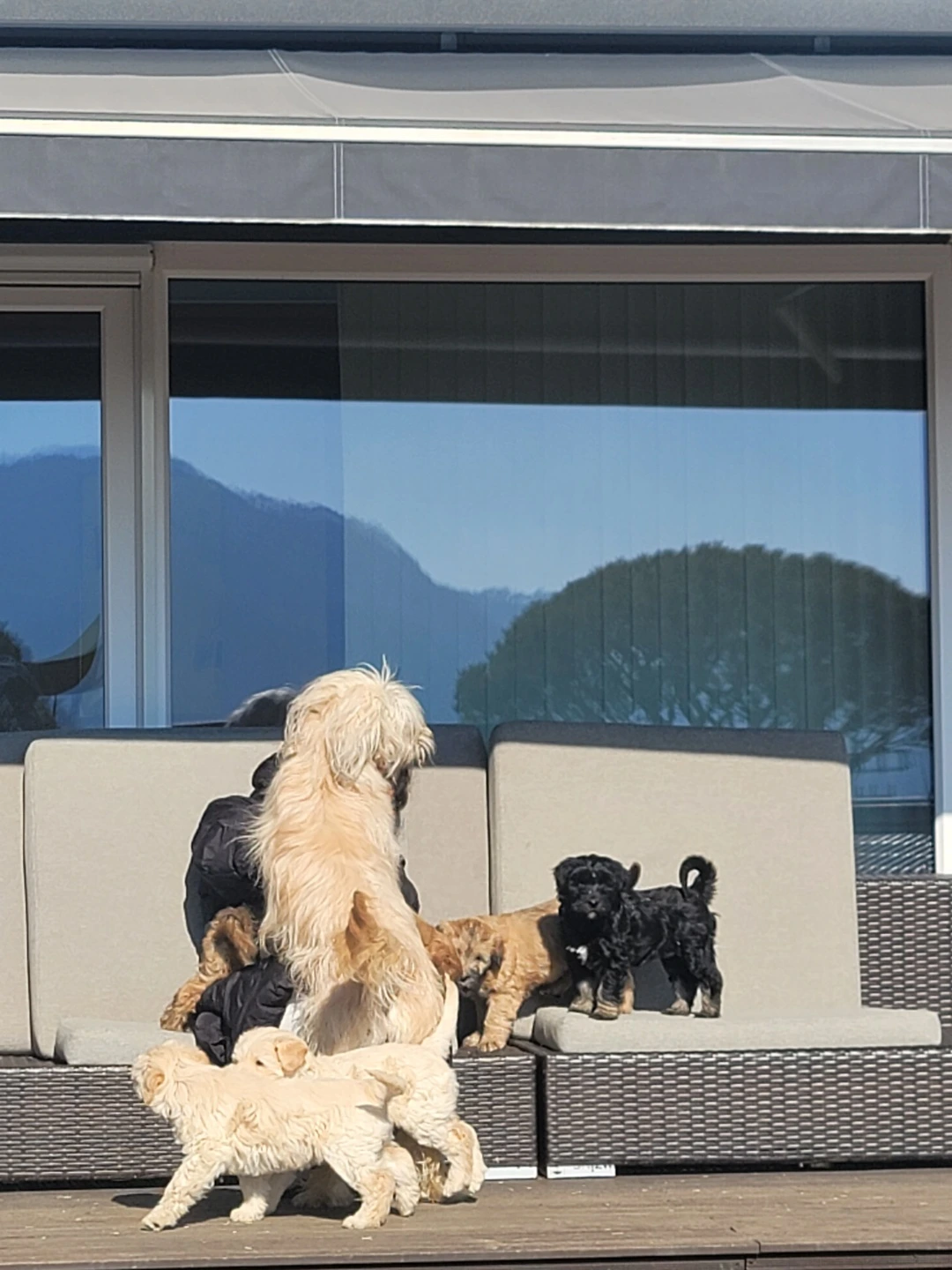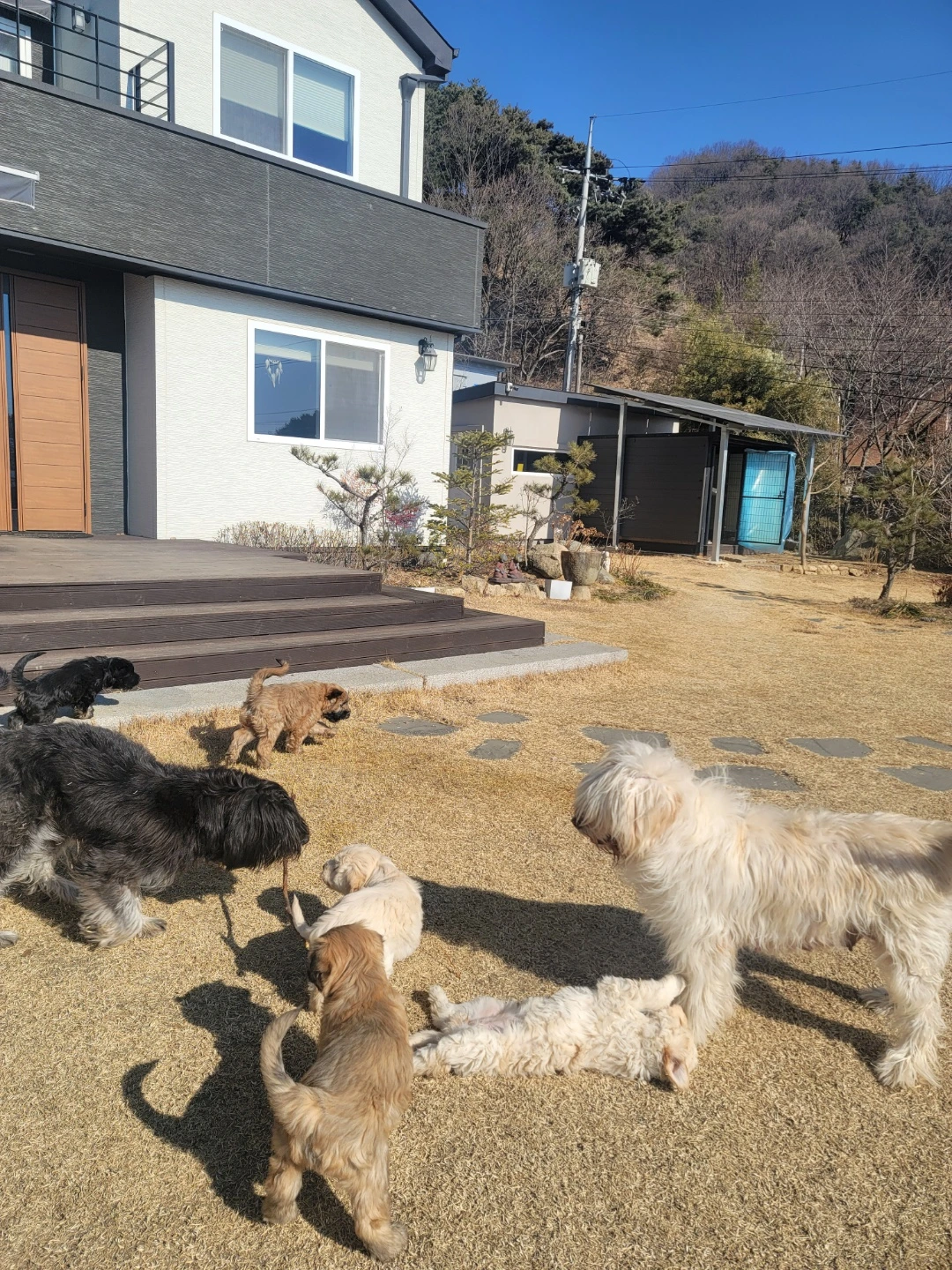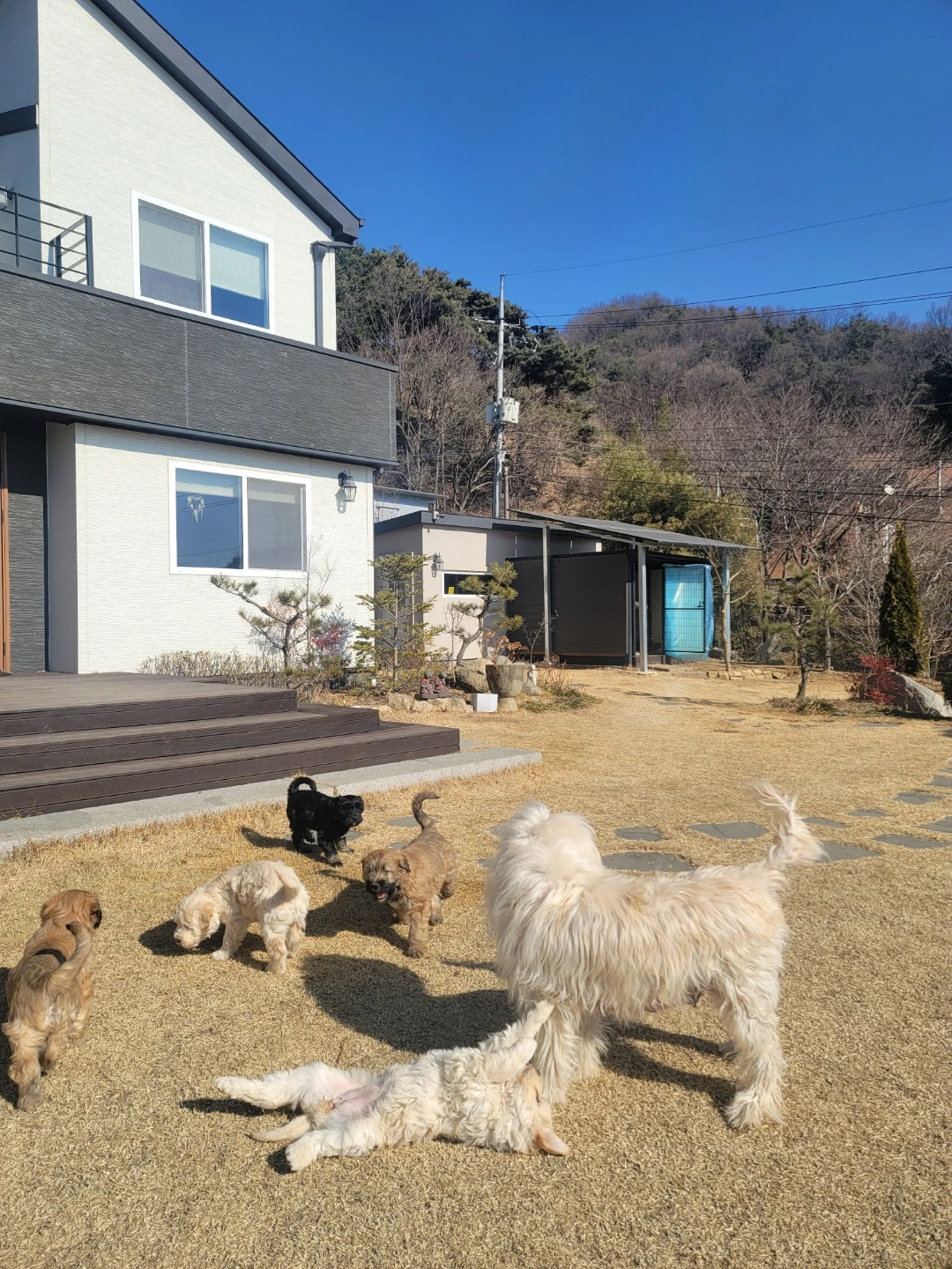 이번 5마리의 아가들은 재작년에 찾아온 아가들보다 태어날 때부터 덩치가 컸고 성장 속도가 남달랐다. 삽살개 재단에서조차 깜짝 놀랄 정도였고 털이 너무 윤기 난다며 아가들 모두 건강하고 너무 좋다고 칭찬이 가득하여 왠지 모르게 내가 뿌듯하고 아가들이 기특하기도 하고 그만큼 두리가 잘 돌본 것이기에 두리가 자랑스럽기도 하였다. 건강한 만큼 성장 속도가 빨라서인지 젖을 먹으면서도 사료를 먹기 시작하는 시기가 지난번 아가들보다 빨랐고, 집 밖으로 나와 잔디밭에서 걷기 시작한 것도 빨랐고, 뛰어다니며 집 마당 동네방네를 다 돌아다니기 시작한 것도, 날아다니며 뒤를 쫓아와서 깜짝 놀라게 하기 시작한 것도, 대소변을 장소를 가리며 최대한 산책 시에 대소변을 누기 시작한 것도 빨랐다. 사실 지난번 아가들은 떠나기 직전까지 두리 집 밖을 나오는 데에도 겁이 많아 힘들어하였고, 잔디밭에서 걷다가 뒹굴다가만 하다 떠나갔는데 이번 아가들은 우리, 두리, 곰이를 따라 한옥집으로 내려갔다 오기도 하고, 뒤 텃밭에 따라 올라가기도 하며 자신들의 영토를 넓혀 갔다. 거기다 앉아 있으면 무릎 위로 올라타서 가만히 앉아서 만져주는 손길을 즐기기도 하고 귀와 꼬리를 팔랑이며 쫓아오기도 하였다. 가끔은 예상한 것보다 따라오는 속도가 빨라 밟을 뻔한 적도 있을 정도로 애교 넘치는 발랄한 아가들로 매일매일이 복닥복닥 되었던 것 같다.