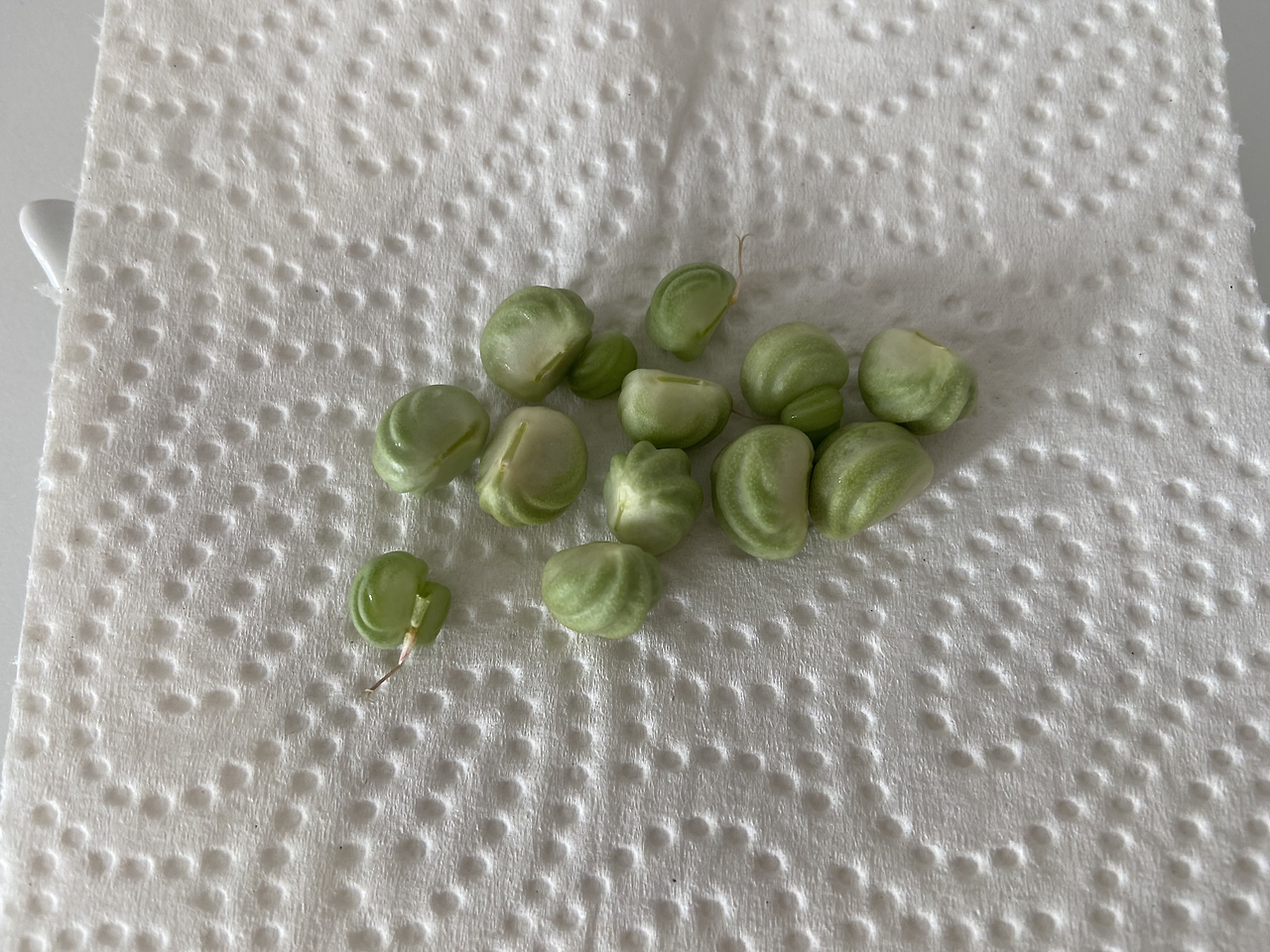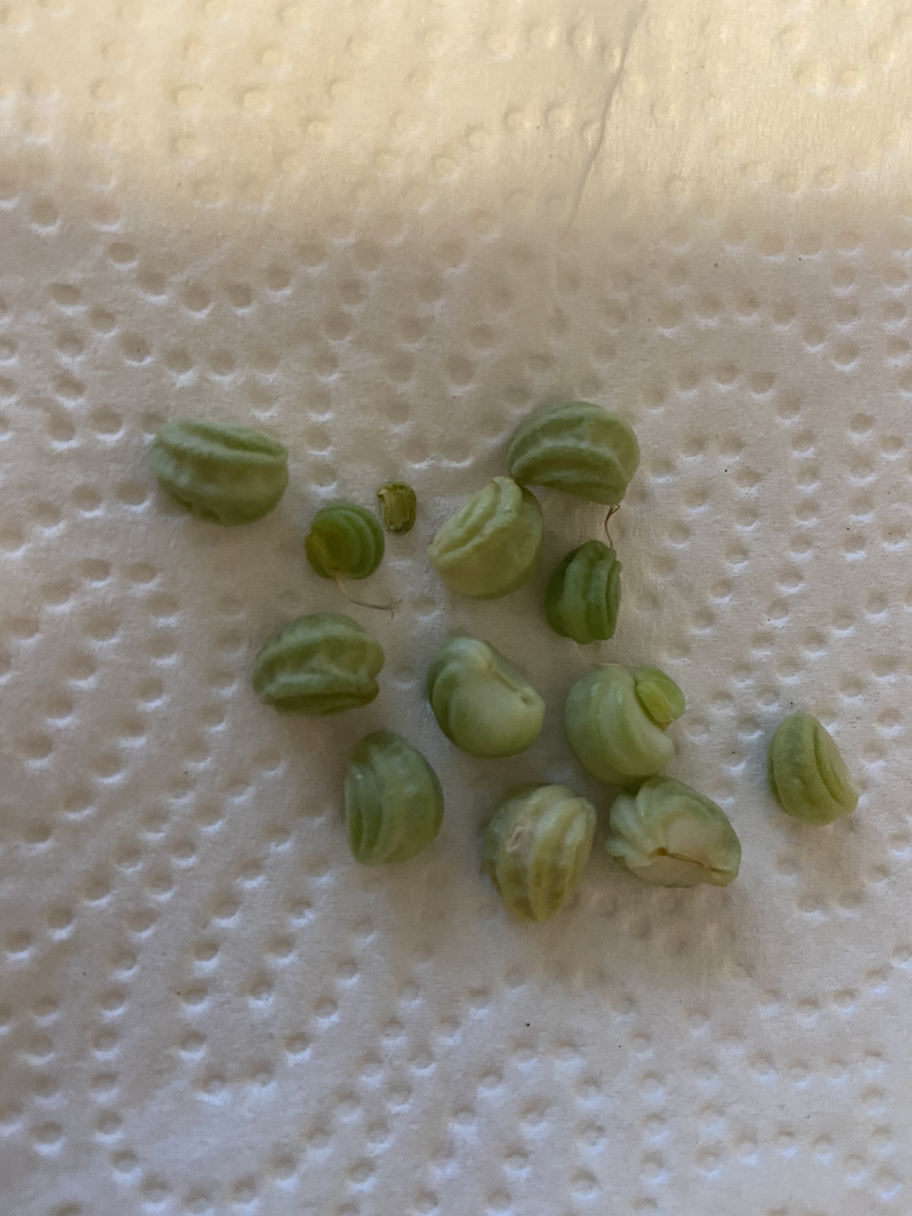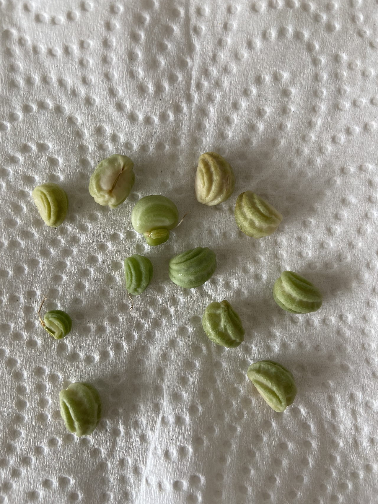그러다 점점 호박 같은 모양의 연두색의 열매가 커진다. 열매가 영글면 채종 하라고 하지만 영근다는 게 무슨 의미인지 알 수가 없어 나는 채종 하는데 꽤나 오래 나 두었다. 약 3주 정도 나돈 후 연두색이 조금은 연노란색으로 변한 것 같아 아주 조금 힘을 줘 보았다. 내 손에 열매들이 네 조각으로 혹은 세 조각으로 쏙쏙 빠지는 게, 마치 이 맛에 사람들이 낚시를 하고 씨앗을 채종을 하는 것일까 라는 생각이 들었다.