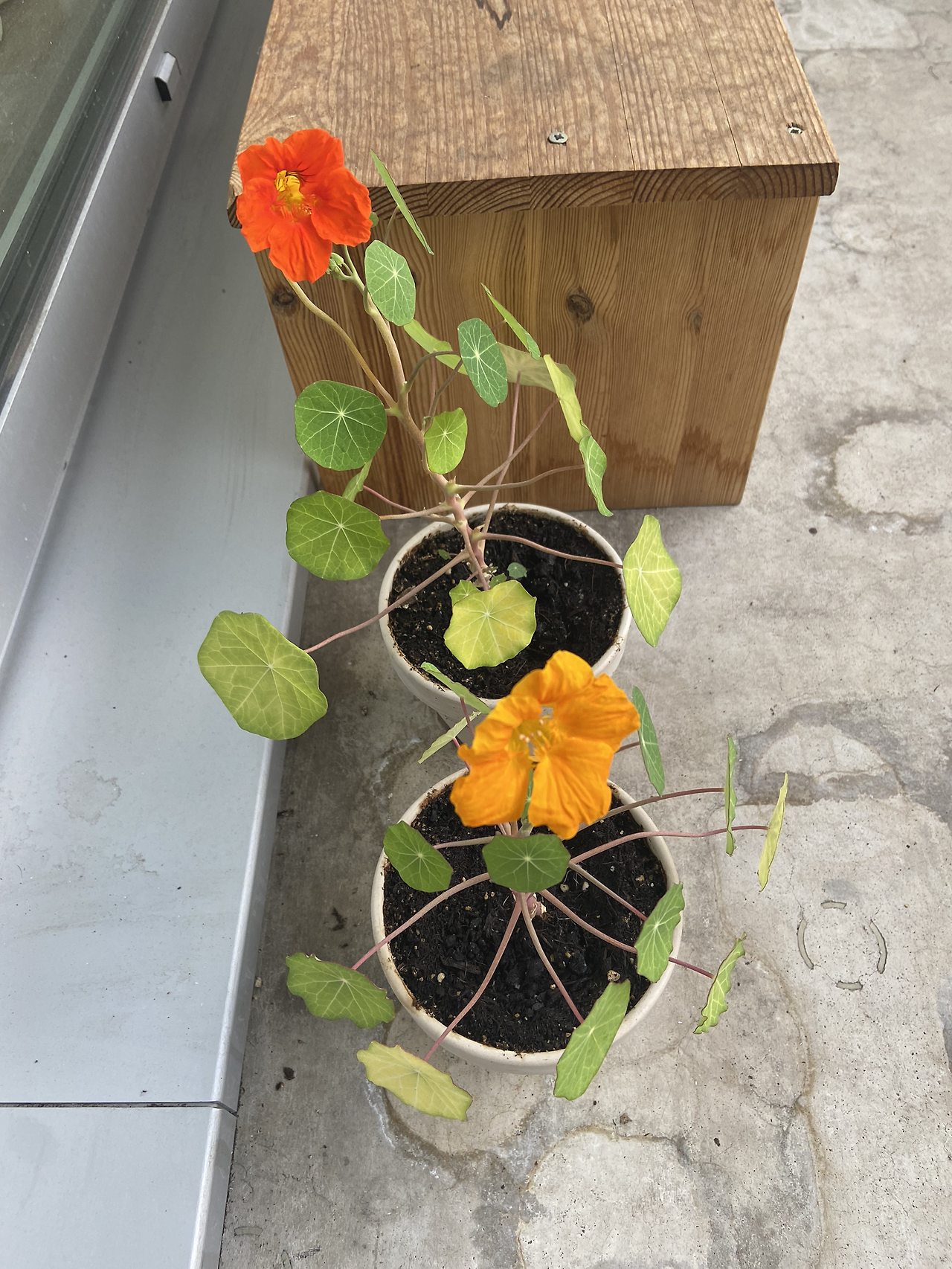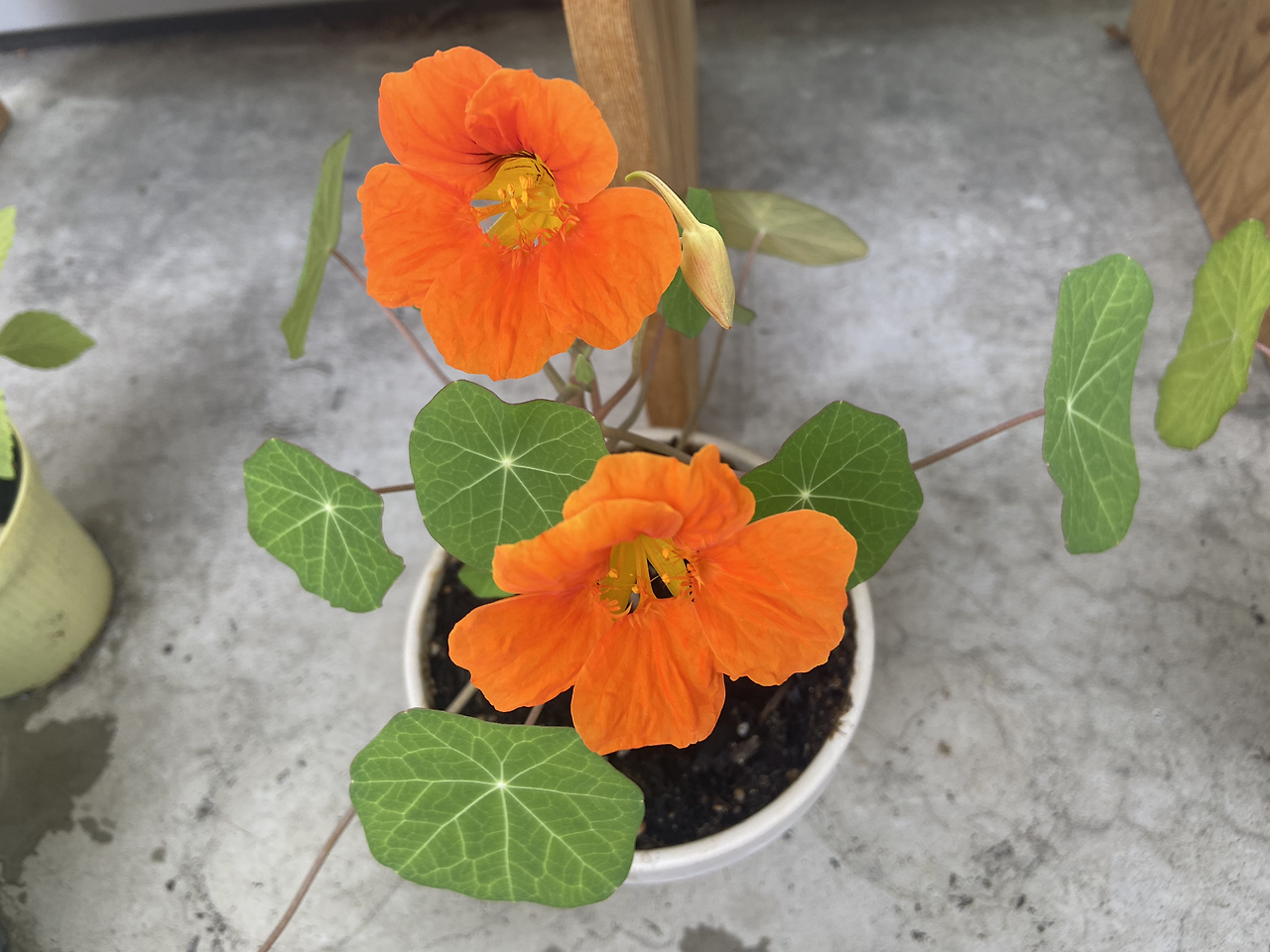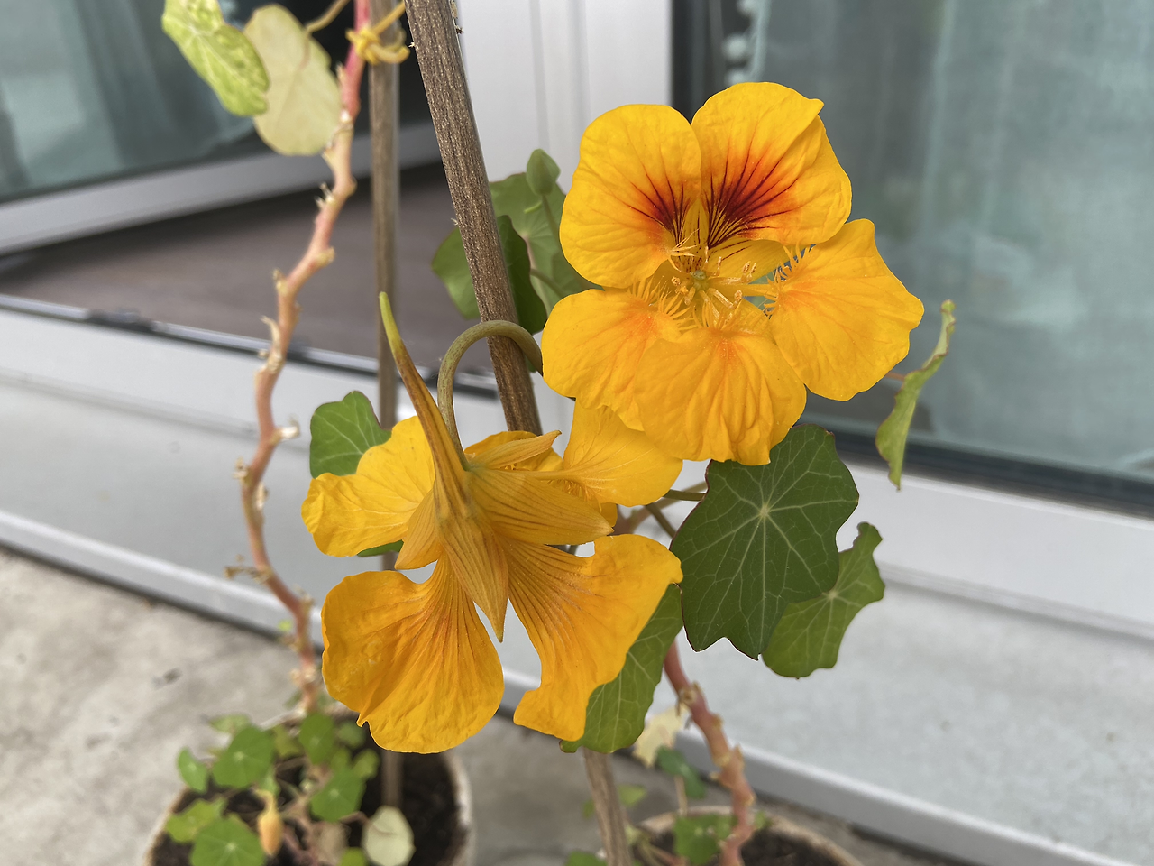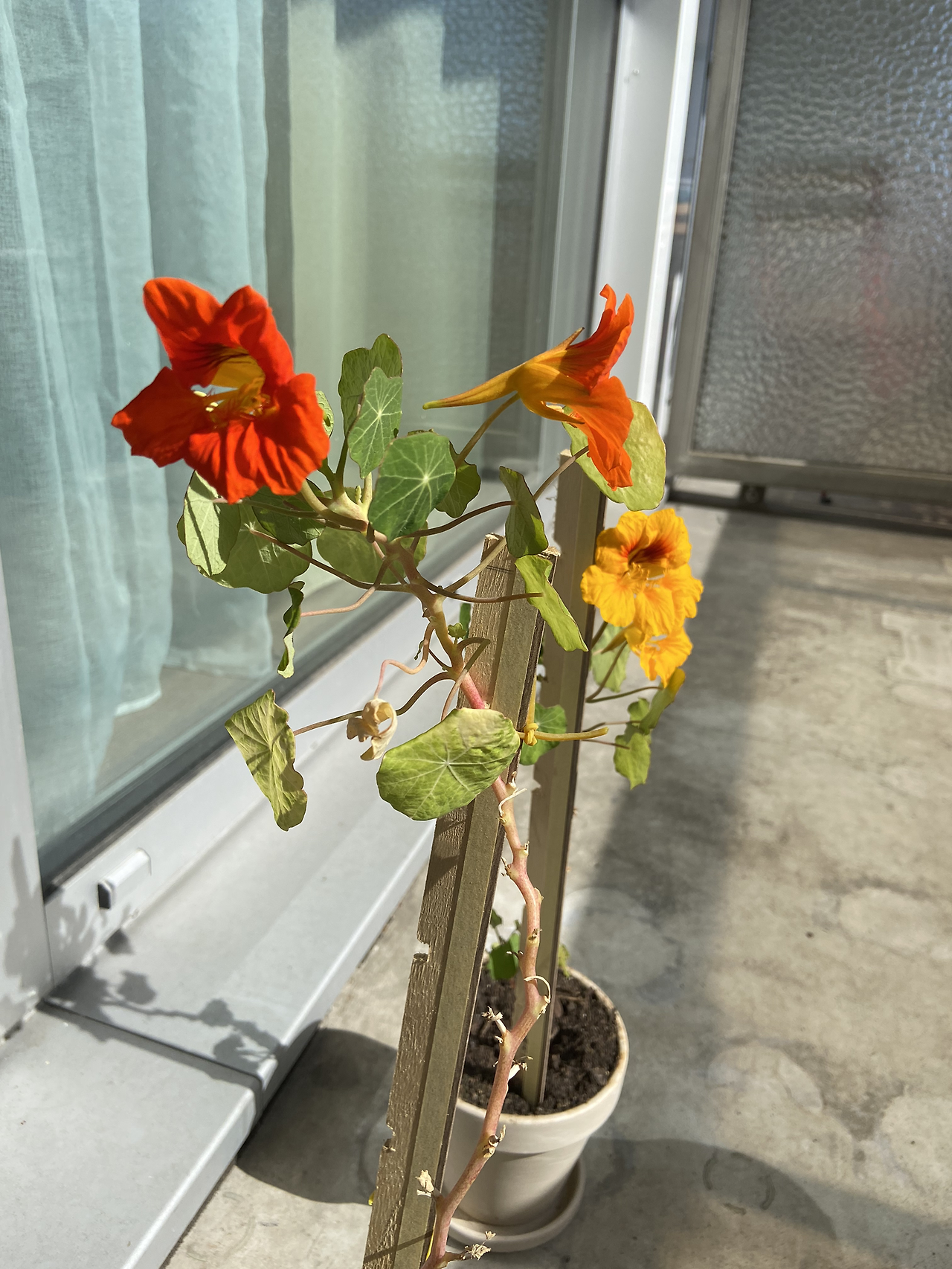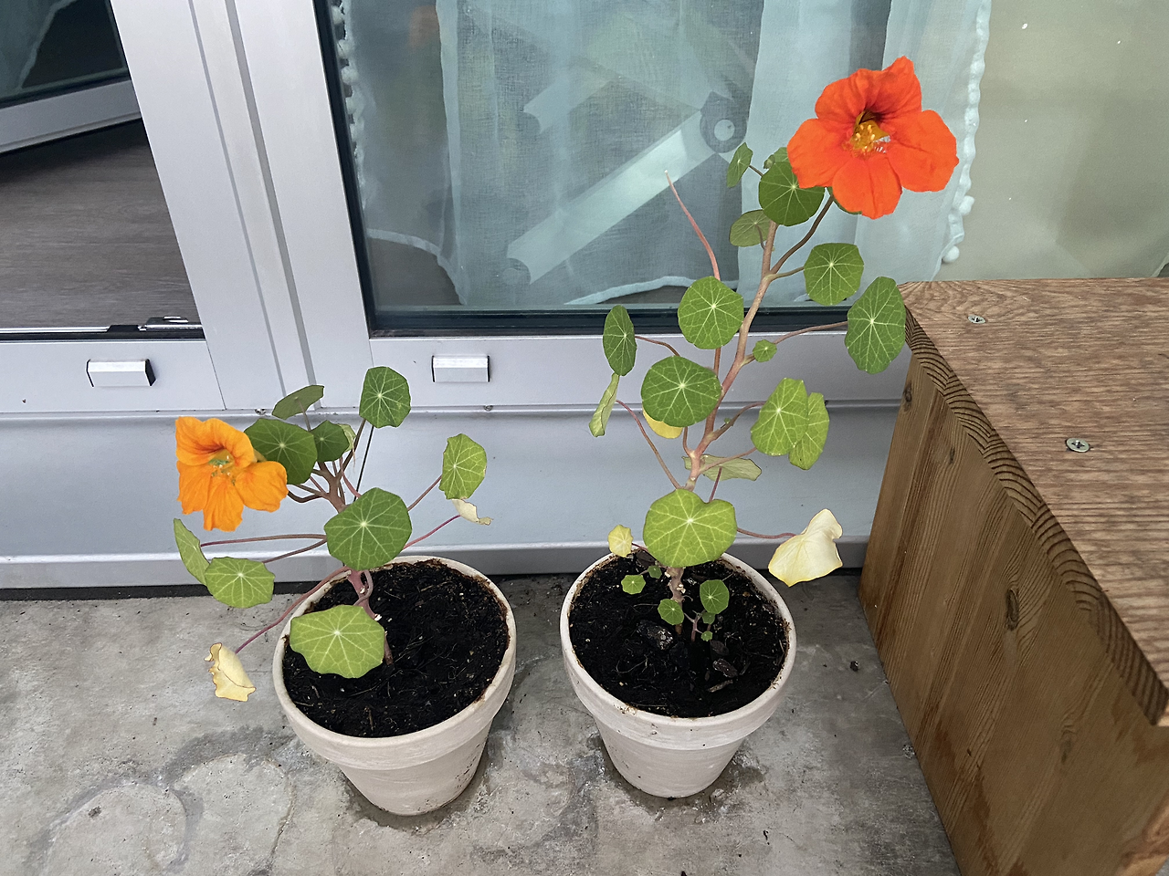 2021년 6월에 깻잎들과 함께 발코니에 씨앗 4개를 가지고 두 개씩 나란히 두 화분에 심은 한련화 이야기이다. 매번 한련화에 대해 글을 쓰려고 했었는데 못 쓰다 이제야 쓰게 되었다. 작년 6월에 한국에서 돌아오자마자 흙을 사서 심은 한련화는 블로그 등에서 찾은 물에 불려서 겉의 단단한 껍질을 까고 심으세요 라는 조언은 무시한 채 화분 두 개를 사서 각각 두 개씩 심었다. 그랬더니 2주도 안 되었을 무렵부터 화분에 하나씩 싹이 났고 급기야 그 해 8월에 꽃을 피웠다. 아직 자라는 중이던 앙증맞은 크기의 식물이 피우는 진한 색의 꽃들은 나를 행복하게 해 주었고, 꽃들은 계속 키를 키우면서도 그 해 10월까지 꽃이 피고 지고를 반복하였다. 그 와중에 나는 그 꽃들에게서 씨앗을 채종 할 생각을 왜 한 번도 못 했을까, 지금 생각하면 아쉽기도 하지만 그래서 더 오래 꽃들을 감상할 수 있지 않았을까 라는 생각도 동시에 든다.