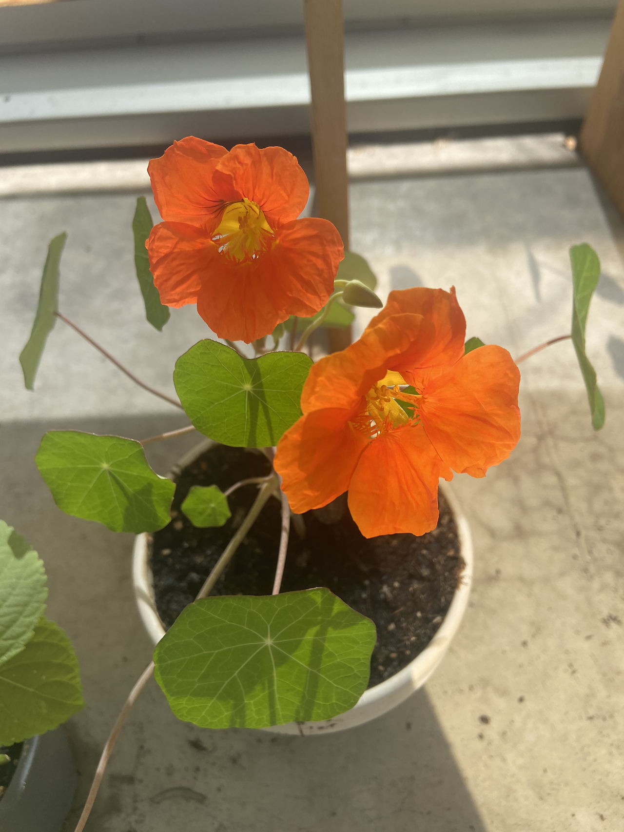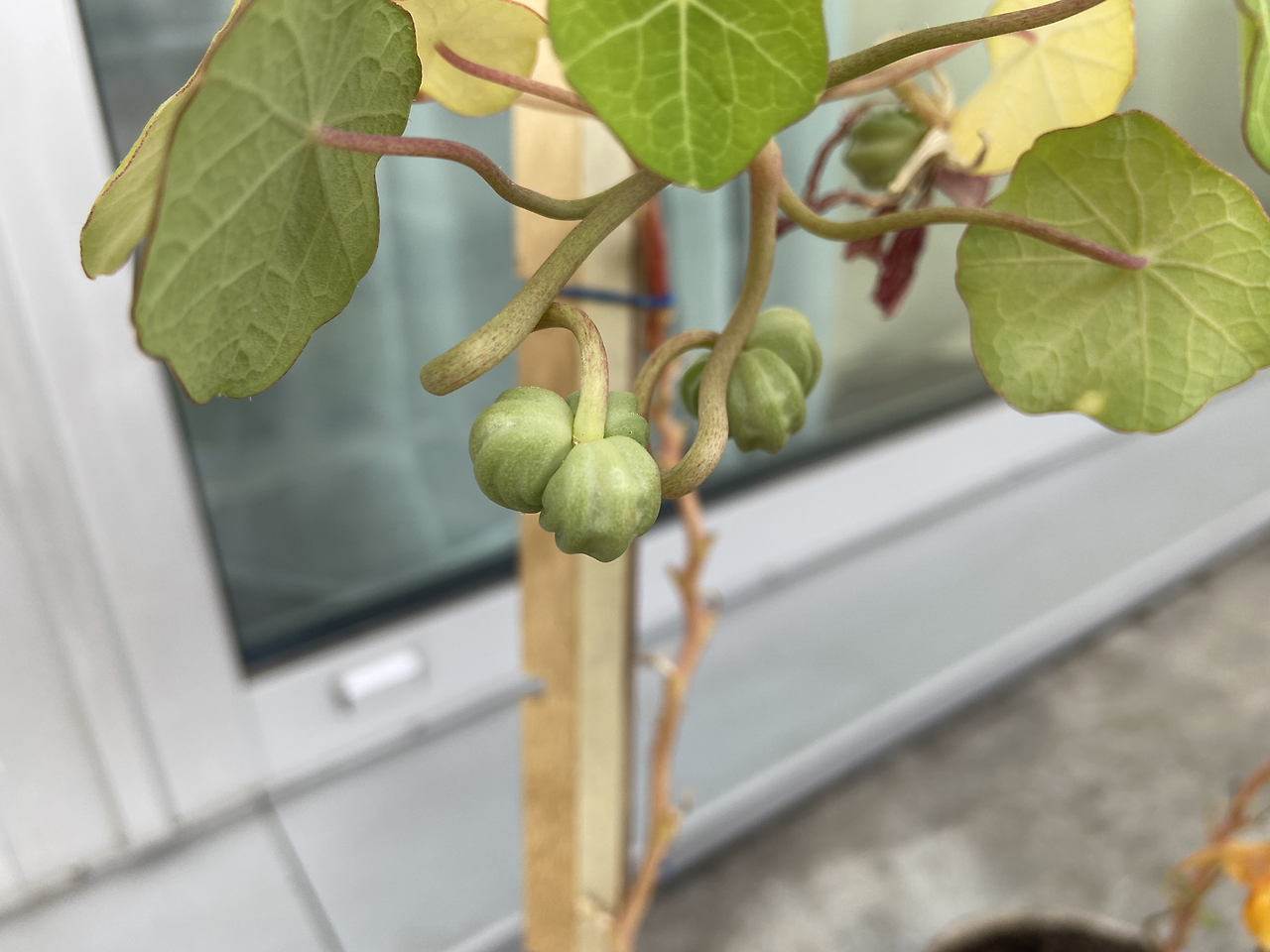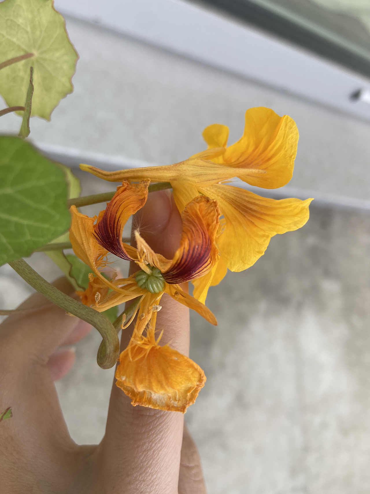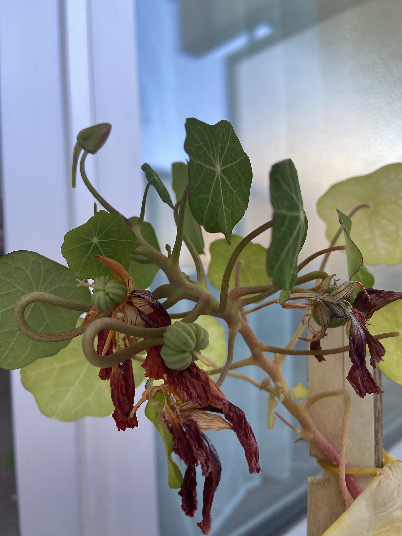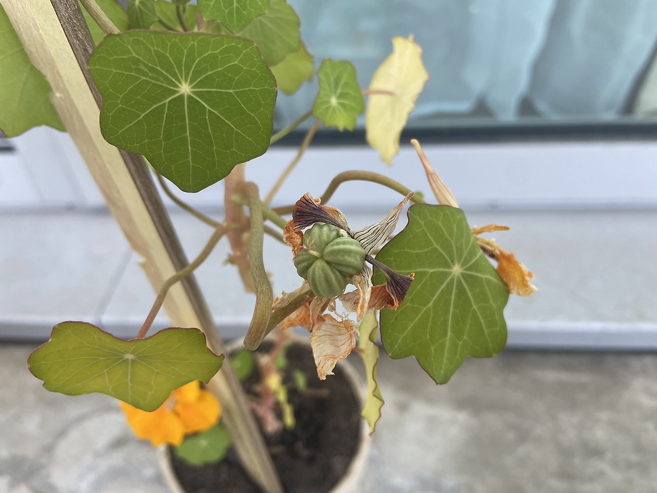 잎이 노랗게 변하면 잘라주었기에 앙상하게 키만 큰 나의 한련화들은 추운 겨울이 지나고 올해 4월, 또다시 꽃을 피워주었다. 겨울에 얼지 않고, 죽지 않고 살아준 게, 거기다 꽃까지 다시금 활짝 피워주는 게 너무나 놀라웠다. 그리고 알게 된 씨앗 채종 방법을 통하여 씨앗이 생기기를 기다렸다. 방법은 단순했다. 면봉으로 꽃 안을 휘적휘적해주면 끝이다. 그럼 수정에 성공한 꽃들이 이틀 내로 고개를 푹 숙인다. 고개를 숙이는 것은, 열매를 맺게 되어 무게가 무거워져서 일까, 아니면 그 열매를 보호하기 위해서 일까?