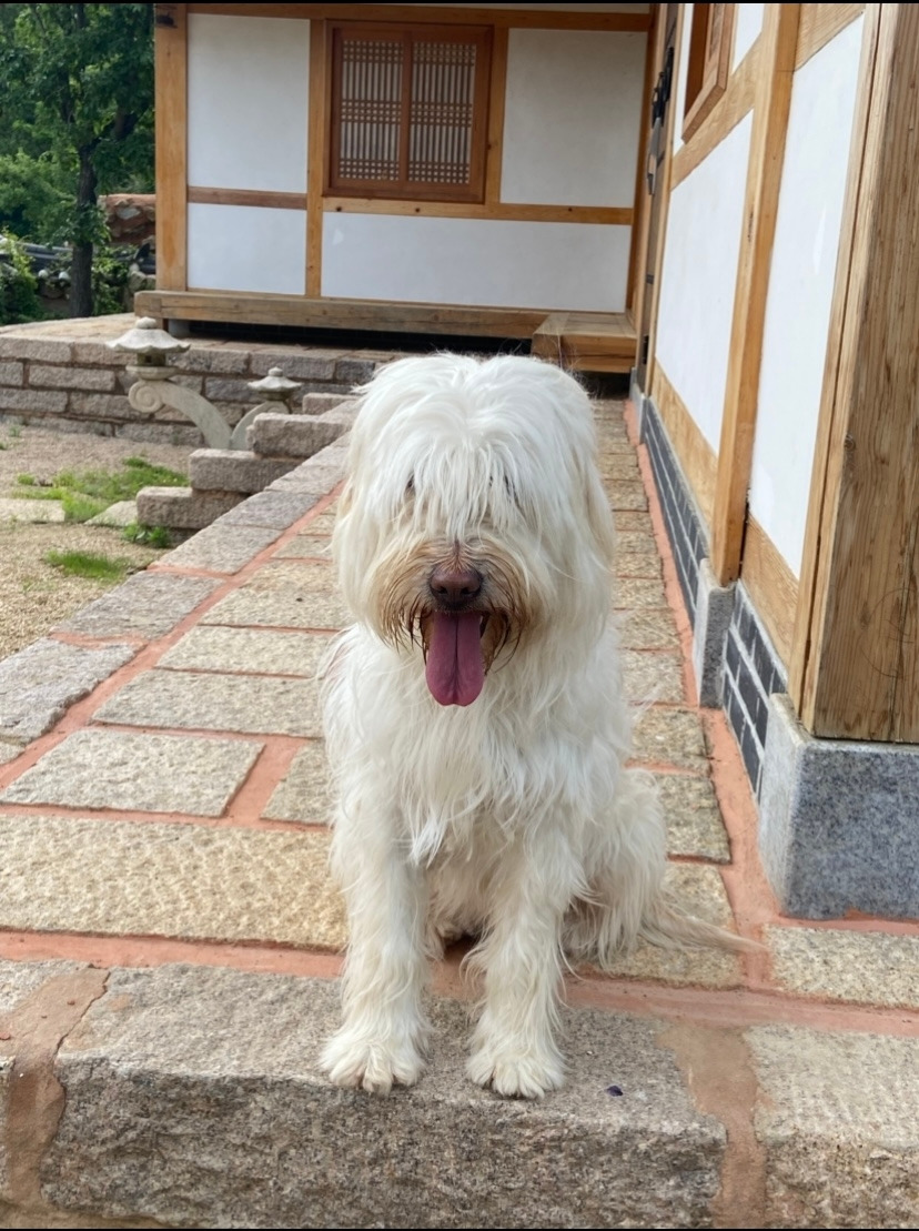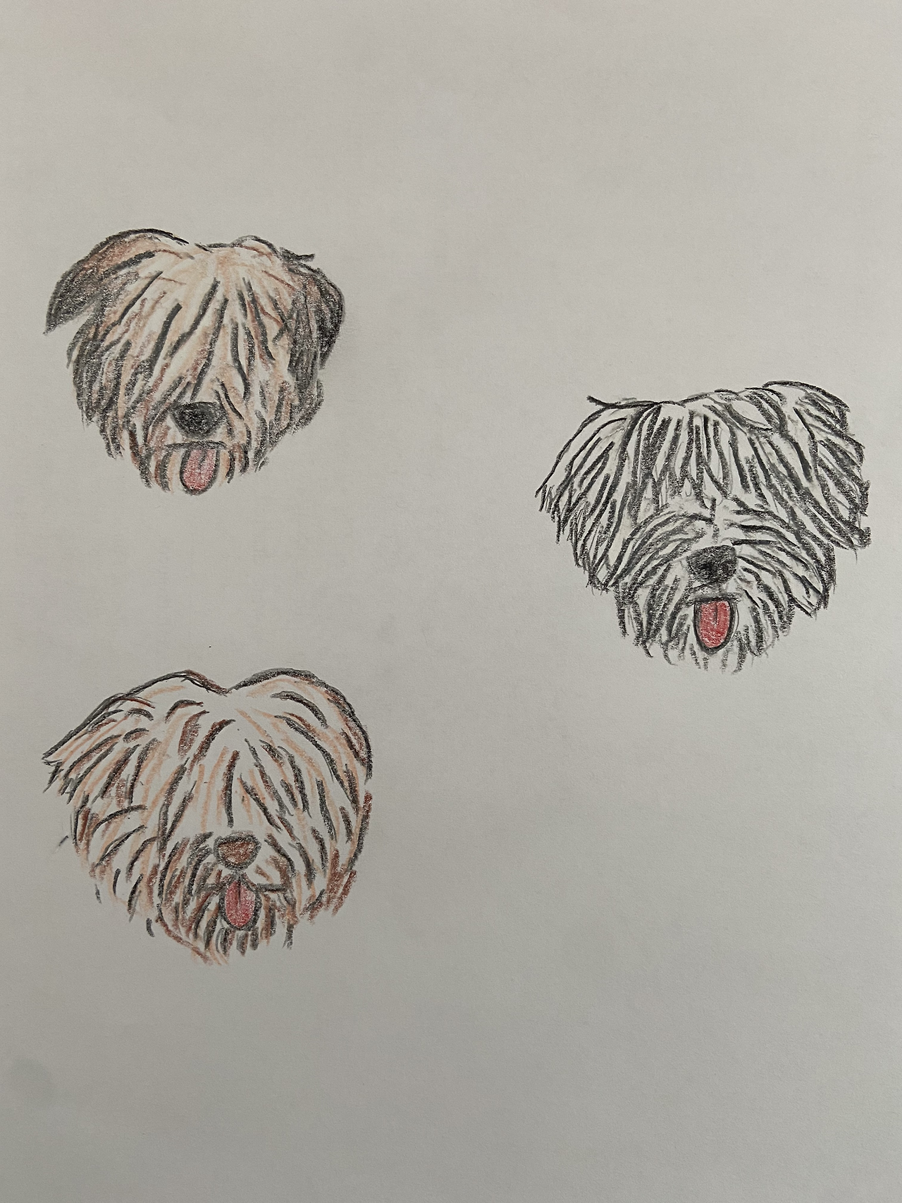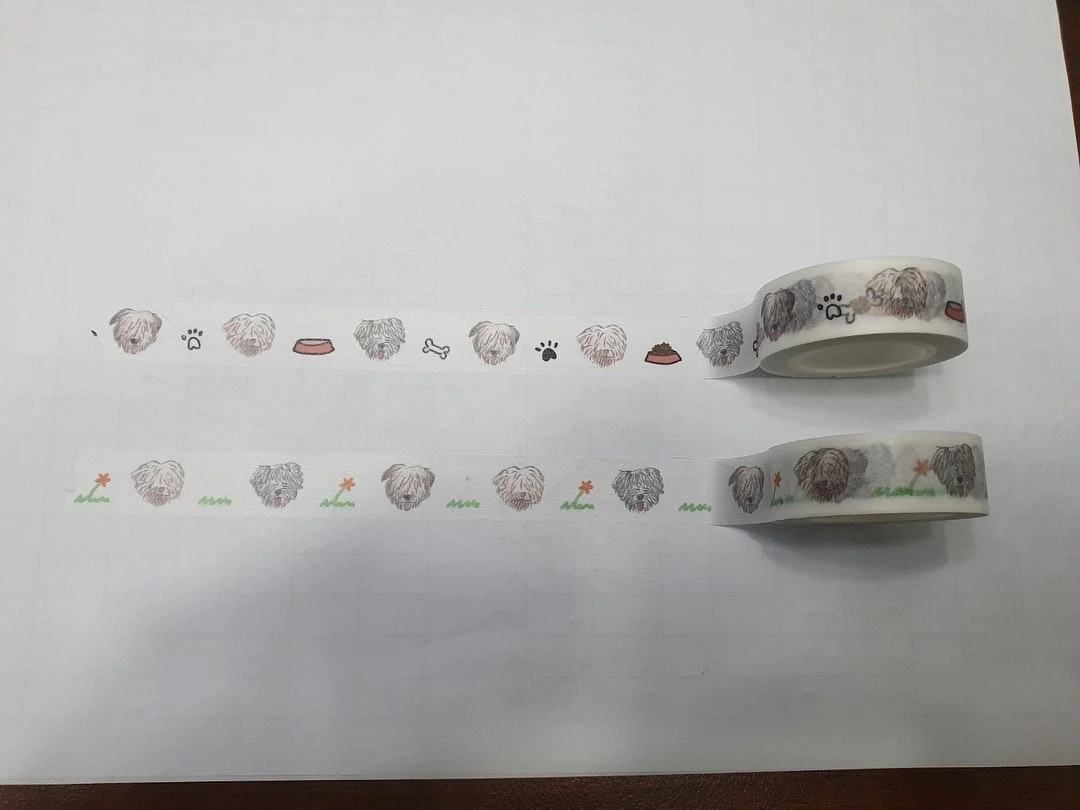 몇 년 전부터 우리, 두리, 곰이가 담긴 문구류를 직접 만드는 것이 여러 꿈 중의 하나로 자리 잡고 있었다. 하지만 그림도 잘 못 그리고 손재주도 없기에 우리, 두리, 곰이를 그린다는 것이 여간 어려운 일이 아니었다. 특히 시바견 등과 같은 견종이 담긴 문구류는 다양하지만 삽살개가 그려진 문구류는 아직 본 적이 없어 예시물도 찾기 어려웠다. 그럼에도 불구하고 역시 포기하지 않고 계속 마음에 품고 도전하다 보면 언젠간 꿈은 이루어진다는 말은 거짓말이 아니었나 보다. 마스킹 테이프, 떡메모지, 스티커 등 여러 문구류를 찾아보다 마스킹 테이프를 제일 먼저 도전해보자 싶어 우리와 두리, 그리고 곰이의 사진을 보며 종이에 색연필로 이리저리 그려보기 시작했다. 몸통까지 그리기에는 아직 용기가 나지 않아 우선 얼굴만 동글동글하게 그렸다. 그리고 아이패드로 사이사이에 넣을 세 마리 모두가 좋아하는 풀, 꽃, 밥, 간식 등을 그렸다.