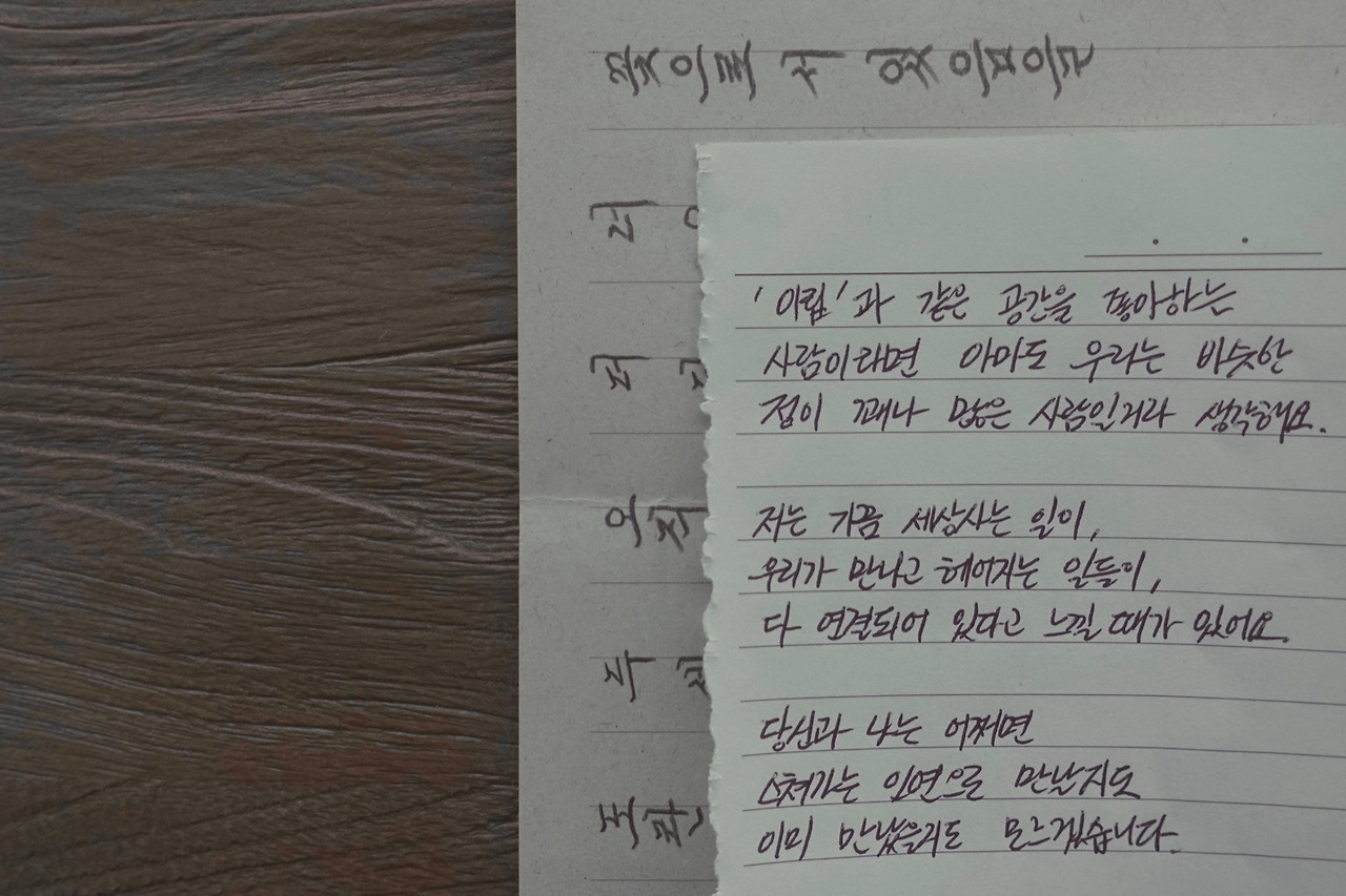 눈 내리던 12월에 열었으니 운영을 시작한 지도 어느덧 반년이 넘었네요. 세 계절이 지날 동안, 나는 이곳에서 많은 얼굴들을 보았습니다. 카운터에 서서 바라보는 그들은 모두 명랑한 얼굴로 들어오고 명랑한 얼굴로는 미처 다 읽지 못했던 이야기들을 편지에 털어놓고 떠나곤 해요. 나는 그들이 앉았던 자리의 방석을 정리하며 한 사람이 머문 온기는 얼마나 오래 남는지에 대해서 종종 생각에 잠기기도 합니다. 단 몇 분만에 흔적없이 사라지는 것일지라도요. 그 사이 문이 열리고, 또 다른 사람이 들어오고, 그 사람이 다시 자리에 앉고요.