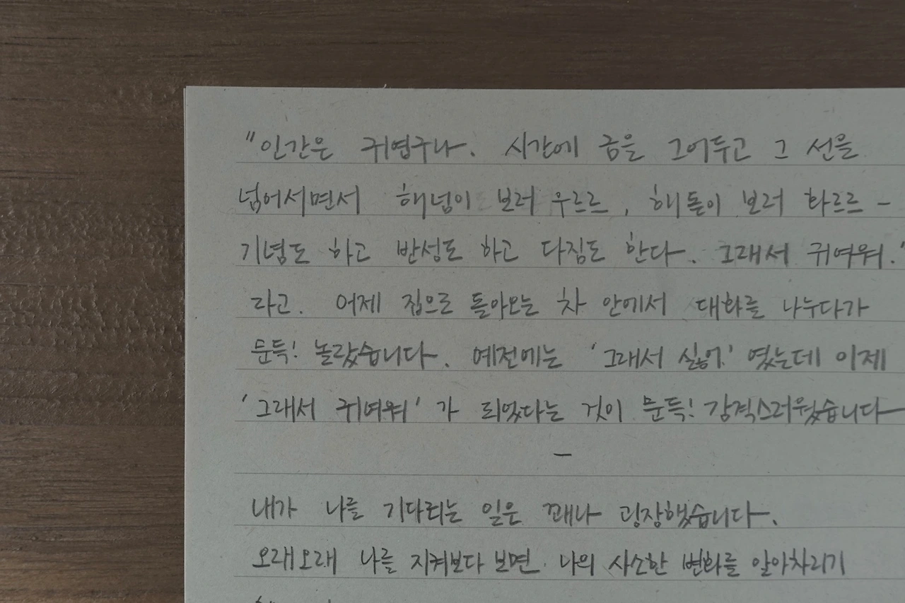 그저 편지를 적어 보낼 한 사람이 있다는 것, 그리고 편지에 적고 싶은 마음이 있다는 것. 그 두 가지만으로도 사람은 세상을 살아가기도 하고, 때로는 살아지기도 한다는 것을요.