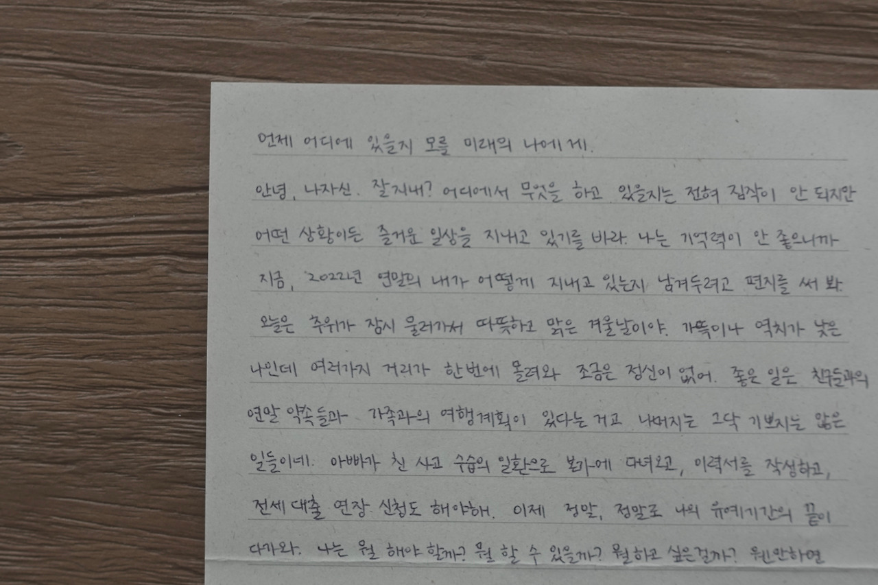 어디에서 무엇을 하고 있을지는 전혀 짐작이 안 되지만 어떤 상황이든 즐거운 일상을 지내고 있기를 바라. 나는 기억력이 안 좋으니까 지금 2022년 연말의 내가 어떻게 지내고 있는지 남겨두려고 편지를 써 봐.