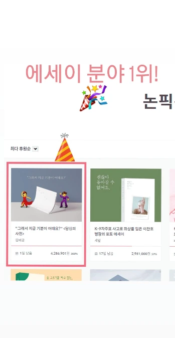<당신의 사전>이 텀블벅의 에세이 분야 1위를 기록했습니다! 처음 텀블벅 프로젝트를 준비할 때 100명의 독자분이 읽어주셨으면 좋겠다는 마음으로 펀딩 금액을 100권으로 설정했는데 오늘 마감일 기준 총 펀딩률 338% 초과 달성으로 무사히 펀딩을 성공하였어요.