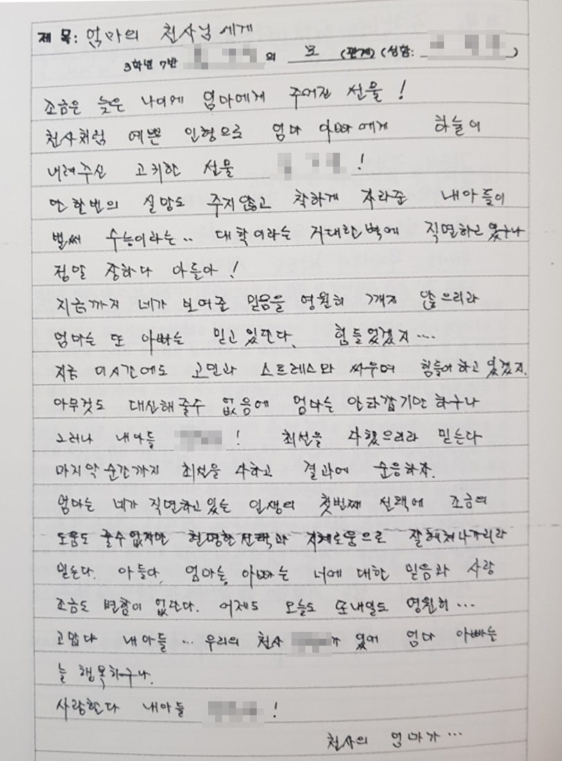 우리들의 속 깊은 이야기(왼쪽), 선생님의 마음을 담은 시(가운데), 사랑하는 어머니께서 남겨주신 편지(오른쪽)