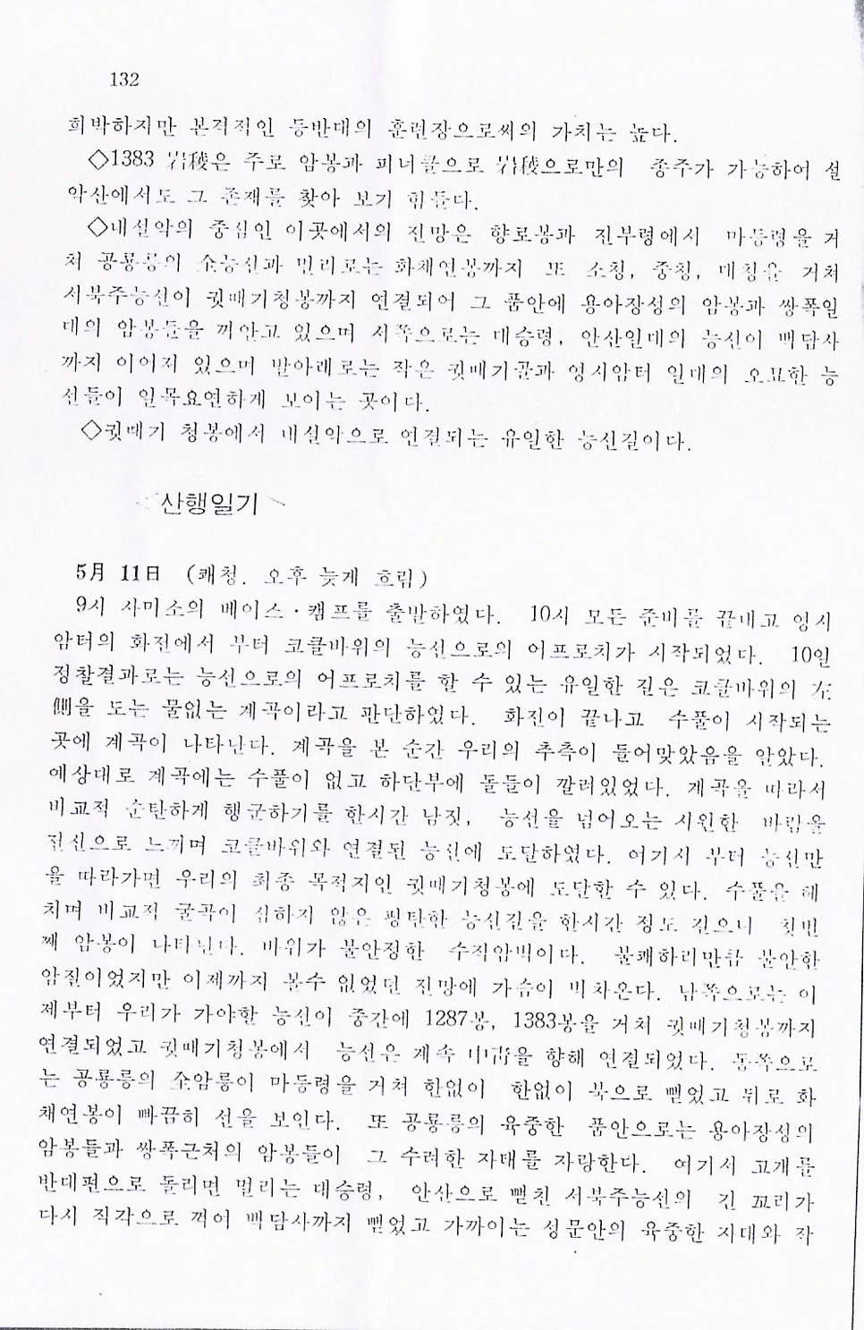 아무도 사람이 밟지 않아 에델바이스가 펼쳐진 설악의 암릉. 넝쿨이 수북하고 사람 발자국 없이 곰만 다닌 흔적만 있어 '곰길'로 불렀다는 누구도 뚫지 않은 산길 (사실 길도 아니고). 곰을 밀렵해 잡혀갔다는 소문이 돈 동네 양봉업자 아저씨. 등반 동료끼리 작은 촛대바위라고 부른 — 산을 타는 사람들이 아는 그 바위가 아니라 — 바위 주변을 밤에 몰래 올랐다가, 근처 군부대 군인이 내려오지 않으면 쏜다고 하여 기록으로 남지 않았다는 길. 장군 바위와 울산 바위 안쪽의 첫 코스들.