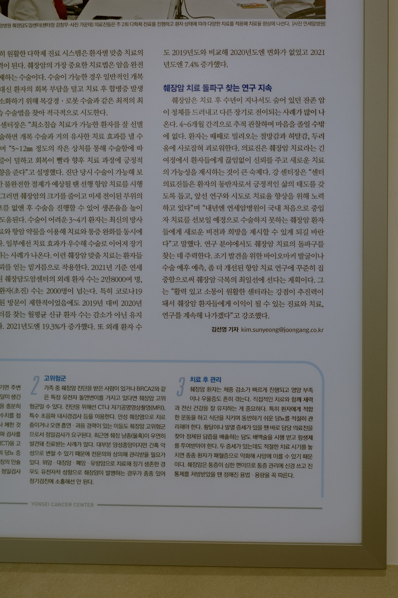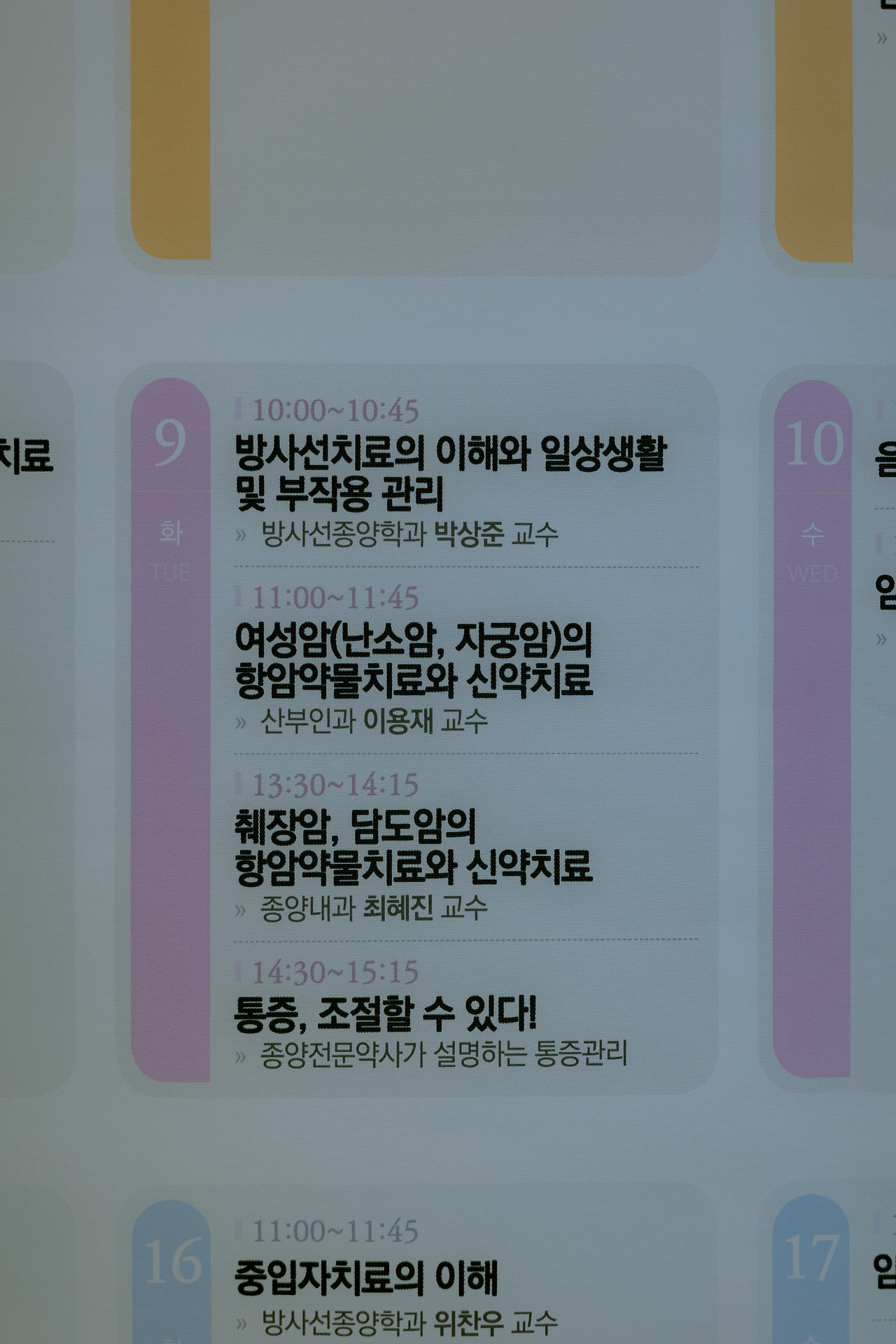 진료 일정에 약간 오류가 있었다. 월요일에 병원에서 연락이 왔는데, 추가 조직 검사가 필요하여 진료 일정을 일주일 미룬다고 했다. 그러나 지난 퇴원 때 받은 아버지의 진통제가 딱 떨어질 시점이었다. 화요일, 우리는 예정대로 병원에 갔다. 본관과 암병원을 연결하는 5층 통로에 앉아서 회색빛 하늘을 바라보았다. 병원 온도는 마치 공공기관과 비슷하다. 너무 춥지도, 덥지도 않은 수준이나, 태생적으로 열이 많은 나와 엄마는 조금 더웠지만, 그 통로만큼은 시원했다. 세브란스병원 암병원 5층에는 '암 지식 정보센터'라는 휴식 공간이 있다. 오후 1시 반에는 췌장암과 담도암에 관한 강의가 있었다. 꽤 드문 기회라서 듣고 싶었으나 시간이 애매하여 포기했다.