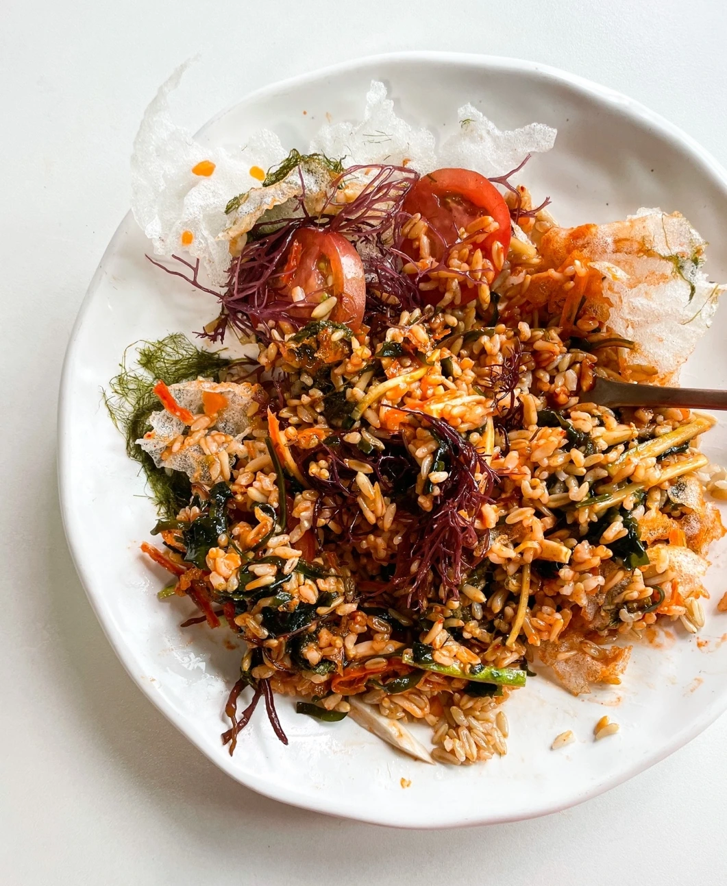 밥과 장이 좋고, 여러 해초의 식감이 더해져 이미 충분한 한 끼였지만 데친 새송이 버섯, 오이와 토마토로 아삭함을 더하고, 라이스페이퍼의 기름기가 더해져 아쉬울 게 없는 훌륭한 비빔밥이었다.
