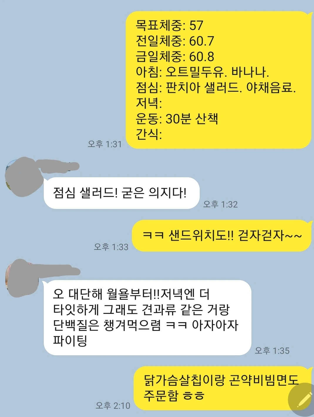 1. 지인 혹은 온라인카페 등에서 모집한 인원들로 다이어트 단톡방을 개설한다. (5명 이내가 적절)