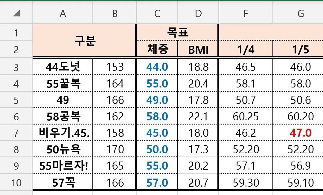 매일아침 설렘과 떨림을 주는 순간3. 모임을 주도한 방장은 매일 엑셀시트로 참여인원의 체중을 집계한 뒤 전체공유한다.
