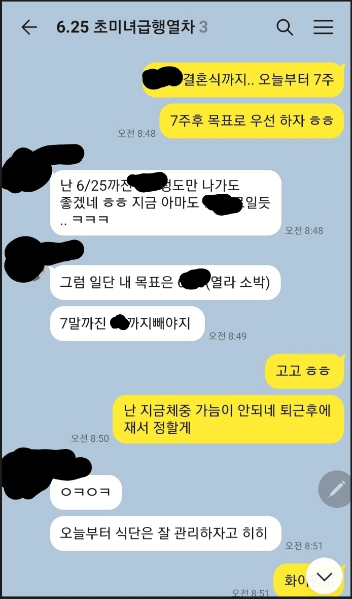 다시 불어난 체중을 관리해야 할 이유는 얼마든지 찾을 수 있었지만, 결정적 계기가 찾아왔다. 자주 보는 대학동기 친구들이 있는데 그중 6월말에 결혼하는 친구가 생긴 것! 우리 중 가장 막차를 타는 이 친구의 결혼식에 '예.쁘.게' 보이고 싶다는 욕구가 모두 뿜뿜했다. 특히나 올해 마흔을 맞이하며 얼굴과 몸이 예전같지 않음을 느끼고 있었기에. 어느때보다 다이어트가 절실했다. 나는 함께 1박 2일 여행을 갔던 2명에게 다이어트 단톡방을 해보자고 제안했다.