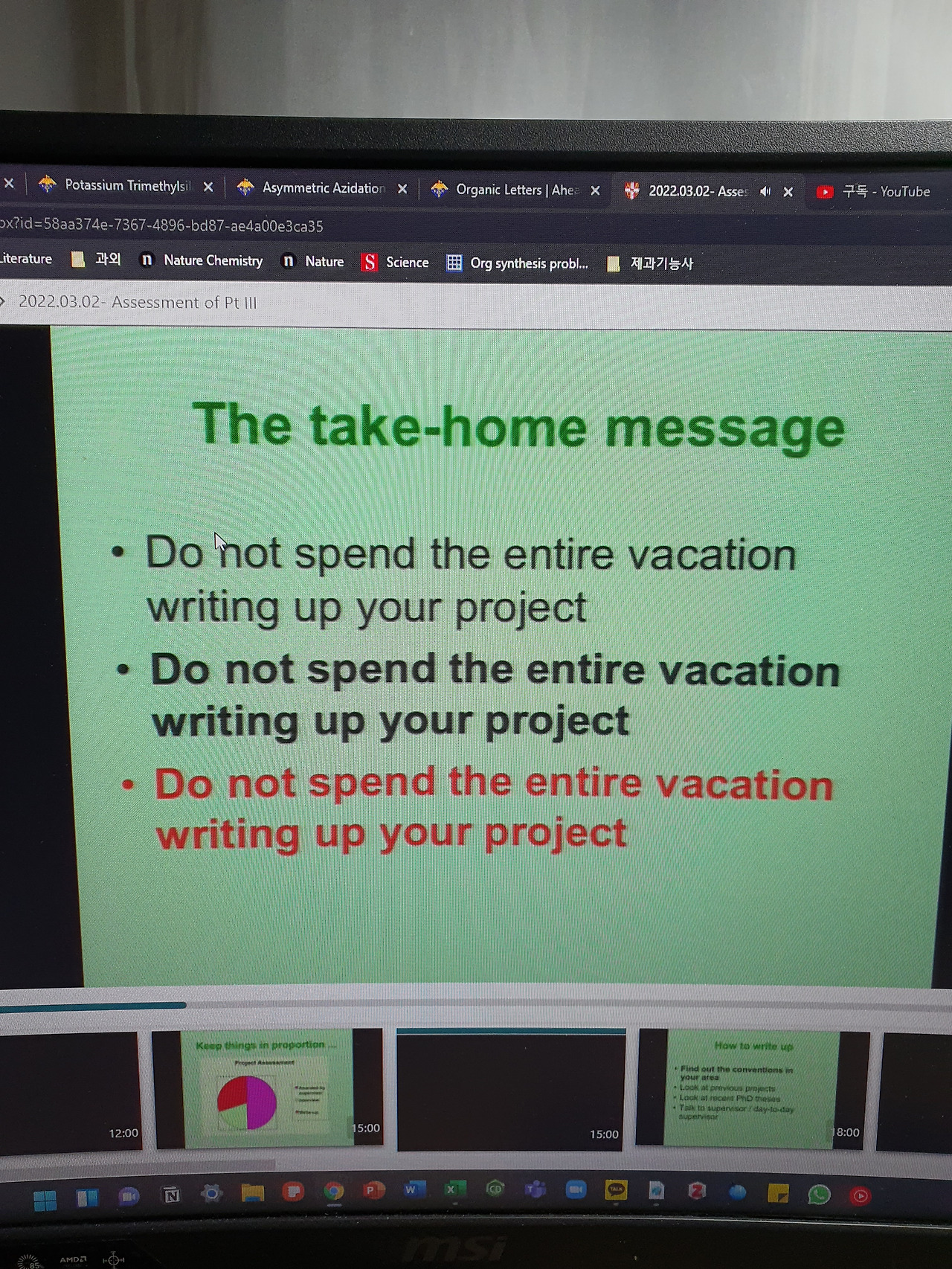내가 속했던 캠브릿지 화학과의 M.Sci의 평가과정은 크게 시험 성적과 연구 프로젝트로 나뉘어 있고, 시험의 비중이 50%로 35%를 차지하는 프로젝트보다 조금 더 높았다 (나머지 15%는 학사 때의 성적이다). 모든 강의는 오전 시간에 이루어지고 또 시험의 비중이 더 높기에, 학과는 우리가 1주일 중 3일만 오후 시간을 연구에 할애하기를 권장했다. 물론 모두가 이를 지킨 것은 아니고, 그에는 나도 포함된다. 교수님이나 내 day-to-day supervisor (랩 안에서의 멘토, 보통 4학년 박사 학생이나 포닥)가 압박을 주신 것은 절대 아니고, 내 프로젝트가 유기 합성이기도 했고, 내가 원했기 때문에 스스로 랩에 더 오랜 시간을 할애하기를 결정했다.