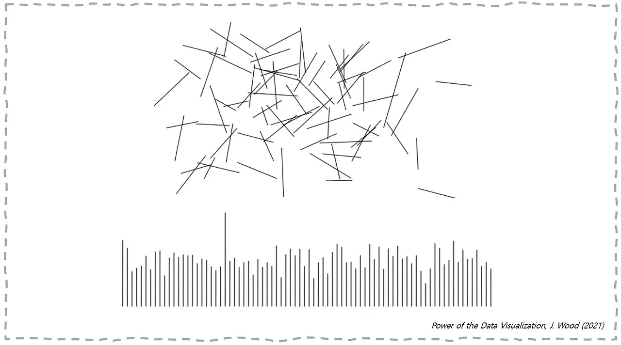 지금 여러분들이 보는 화면에는 여러 개의 서로 다른 길이의 선들이 한 군데 뭉쳐져 있습니다. 제가 만약 여러분들에게 이 중에서 가장 길이가 긴 선을 무엇이냐고 묻는다면 어느 하나를 골라내기가 쉽지 않으실 겁니다. 그런데 만약 제가 이렇게 상황을 바꾸어 질문을 한다면 여러분들은 보다 직관적으로 저의 질문에 대한 답을 찾을 수 있을 뿐만 아니라 다른 것들에 비해 얼마나 다른지 특징을 공유할 수 있게 됩니다. 이렇게 제가 직선이라는 정보의 내용은 바뀌지 않았는데도 정보를 어떻게 표현 하느냐에 따라서 찾고자 하던 차이를 더 빨리 알아차리기도 하고 전반적인 데이터의 특성을 더 쉽게 전달할 수 있기도 합니다. 데이터사이언티스트들은 예를 들어 제가 여기서 사용한 시각화 분석 기법을 포함해서 다양한 방법을 활용해서 정보의 본질을 꿰뚫어보고 질문자의 의도에 맞는 답을 찾을 수 있다고 하여 데이터의 인사이트를 찾는다고 말합니다.