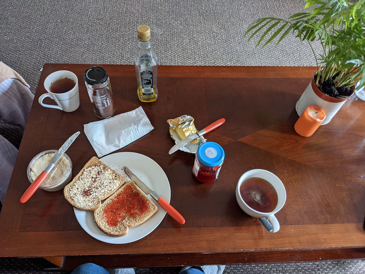 이 사진을 보면, 중동 국가 출신인 그녀를 따라 통밀 식빵 위로 후무스를 바르고 향신료 Sumac을 뿌리는 나에게 혹시나 모른다며 딸기잼을 바른 조각을 준비하라던 그 날의 친구 목소리가 재생된다. 전날의 긴 대화에도 모자라, 잉글리쉬 블랙티가 너무 진하게 우려날 만큼 찻잔 한번 들 생각조차 하지 않고 주고받던 생각들도 사진 안에 담긴 것 같다. 찻잔이 하나 밖에 없다며 머쓱해하는 친구에게 우리끼리 집인데 아무 컵이면 어때 물컵이냐 찻잔이냐 분류를 미뤄두자던 웃음도 함께 떠오른다.