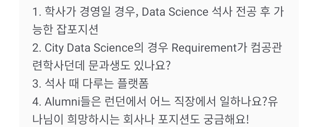 답변4. 저는 박사 진학을 고려하고 있어 경우가 조금 다를 것 같습니다. 학교에서 공식적으로 홍보하는 졸업생 진로는 Retail, IT, 정부기관 등이 있습니다. Retail은 Sainsbury's 또는 Tesco와 같은 슈퍼마켓 체인을 위주로 생각하시면 되겠습니다. IT 기업의 경우 런던 도시 특성상 금융, 핀테크 기업에 기회가 많은 편입니다. 함께 수업듣는 동기들 중 직장이 있으면서 공부를 하러 온 경우, 은행 또는 보험회사를 많이 본 것 같습니다. 일반 IT회사도 많았습니다.