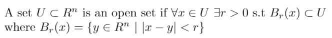 A set U which is a subset of R n is an open set if for all points x in U there exist a radius r greater than zero such that B r x is in U where B r x is the set of all points y in R n such that y minus x magnitude is less than r