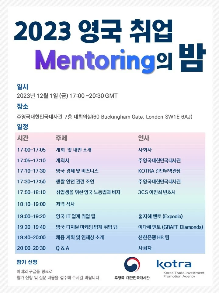 지난 번 코트라에서 진행되었던 영국취업 멘토링 행사에 이어 12월 1에 열리는 행사에 또 초대받게 되었습...