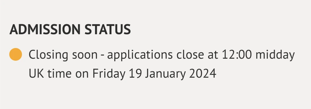 최상위권 대학들은 1월 중순까지 지원 마감을 서둘러야 하고 맨체스터 대학 정도 수준의 (석사 기준) 인기 학과들은 대개 설 연휴 전에 모집을 닫는 편이다. 영국 대학들이 아무리 경쟁률이 높아도 그들 스스로 (석사 통합과정이 아닌) 학부과정 출신 지원자를 배제할 수 없다. 그래서 대게 마지막 학년에 재학중인 학사생들의 졸업예정 성적과 졸업 논문 진행 평가가 어느 정도 나와야 하기에 + 합리적인 원서 준비기간을 고려하여 선정된 어드미션 배치가 1월 말-2월 초가 된다. 한국은 설 연휴로 기억하면 쉽다.