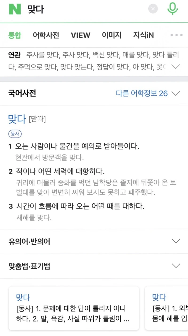 내가 쓴 답이 다 맞아서 백 점을 맞았다. 손님을 맞이하였는데 그만 눈이 맞고 마음이 맞았다. 올 겨울 같이 눈을 맞기 전에 독감백신을 먼저 맞기로 했다. 주책맞게 이런 글을 쓰는 나는 인플루언서가 되고 싶은 아줌마 참 곰살맞다. 그래서 손바닥을 맞으려나? 맞네 맞네.^^