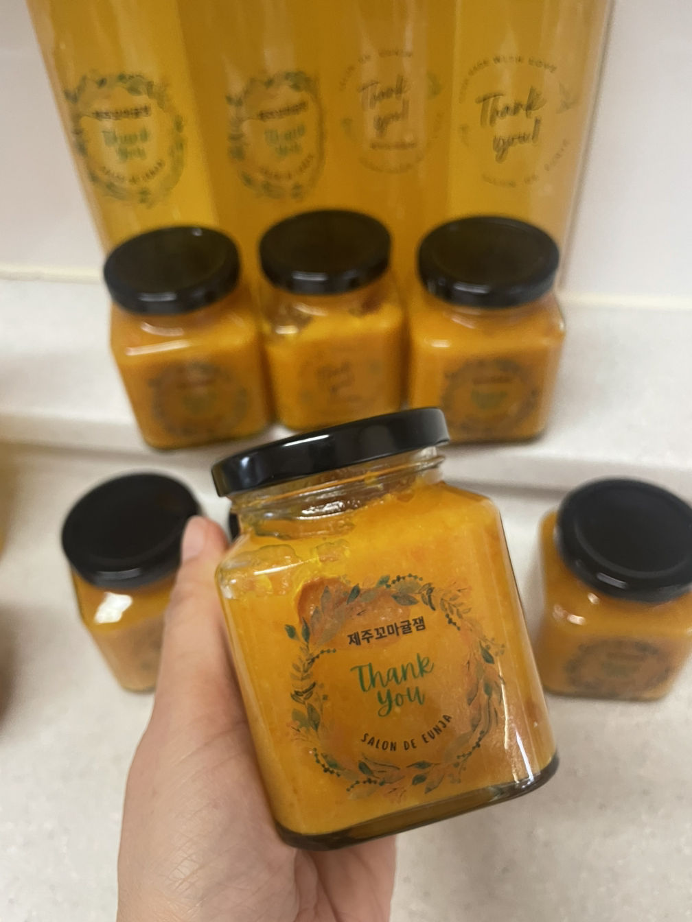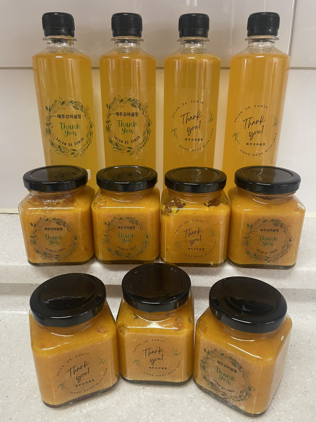 보기만 해도 침이 고이죠? 한 번 맛보면 깜짝 놀랄 거예요. 세상에 없는 맛이거든요. 특히 귤잼은 '와! 어떻게 이런 맛이 나지?'라고 다들 말해요. 그리고 그다음 말은 '이거 팔아라' 예요. 매번 듣는 얘기입니다. 꼬마귤잼은 시중에 파는 그 어떤 귤잼과도 맛을 비교할 수가 없답니다. 재료부터 다르니까요.