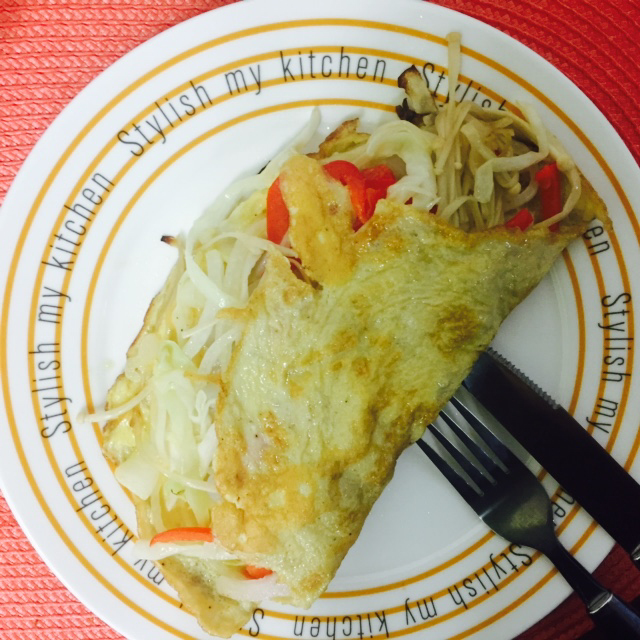 5. 채소를 덜어내고 후라이팬에 한번 더 올리브유를 두른 뒤 준비해둔 계란물을 부어준다 (이때 가스 불은 처음엔 중간불로 굽다가 계란이 반숙이 되면 약불로 줄여준다)