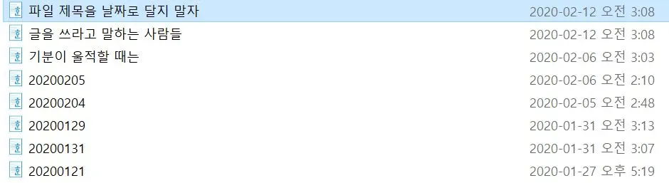 ‘이걸 써야지!’ 하고 글을 시작하는 경우는 거의 없다. 빈 한글 문서파일을 켜놓고, 습관적으로 제목에 ‘20200211’과 같이 날짜를 적어 저장해놓은 뒤 글을 쓰기 시작한다. 반면 ‘이걸 써야지!’ 마음먹고 한글 파일을 켠 경우에는, 우선 글을 쓴다. 저장할 정신이 없는 거다. 한참 쓰다가 잠깐 틈이 생기면 그제야 저장이 안 돼서 글이 날아가면 낭패를 볼지도 모른다는 생각에 임시로 저장을 한다. 따로 제목을 지정하지 않기 때문에 자연스럽게 첫 문장이 제목으로 저장된다.