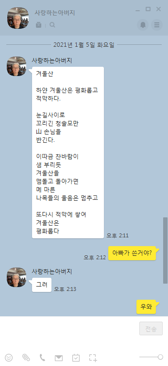 겨울산 / 오세혁 하얀 겨울산은 평화롭고 적막하다눈 길 사이로꼬리긴 청설모만 山 손님을 반긴다이따금 찬바람이샘 부리듯 겨울산을맴돌고 돌아가면메마른 나목들의 울음은 멈추고 또다시 적막에 쌓여겨울산은 평화롭다